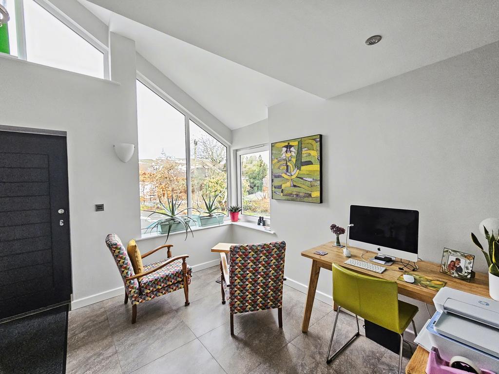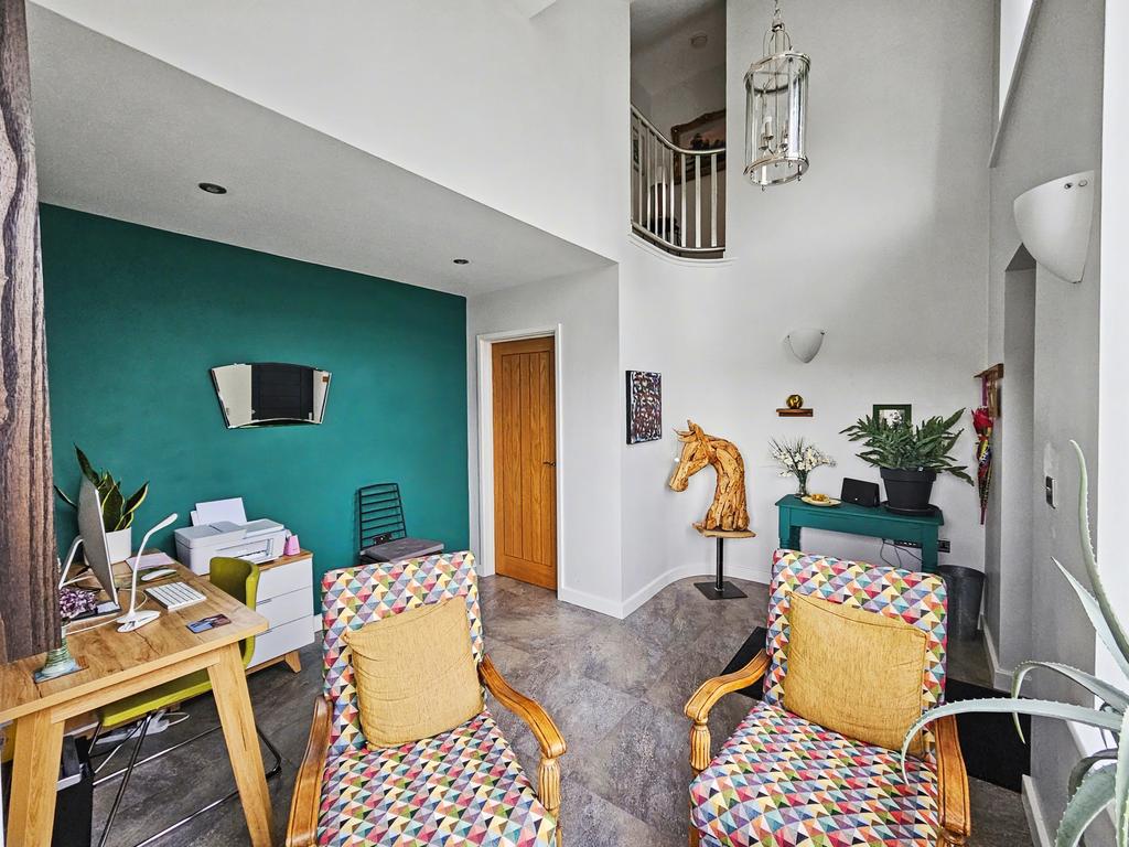 RECEPTION ROOM/OFFICE/SNUG (4m x 3.5m approx)(13'1" x 11'4" approx) with stone tiled floor, galleried first floor landing, two large windows with far reaching views, ceiling lights, wall light, large glass light fitting, six power points, telephone point, and door to inner hallway.