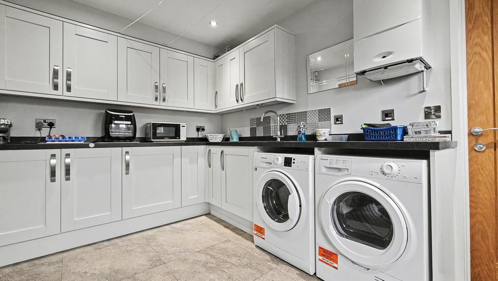 UTILITY ROOM (3.7m x 2.5m approx)(12'1" x 8'2" ) with stone tiled floor, built-in units; including five wall cupboards, sink unit with tiled splashback, laminate worktop, and seven wall cupboards.