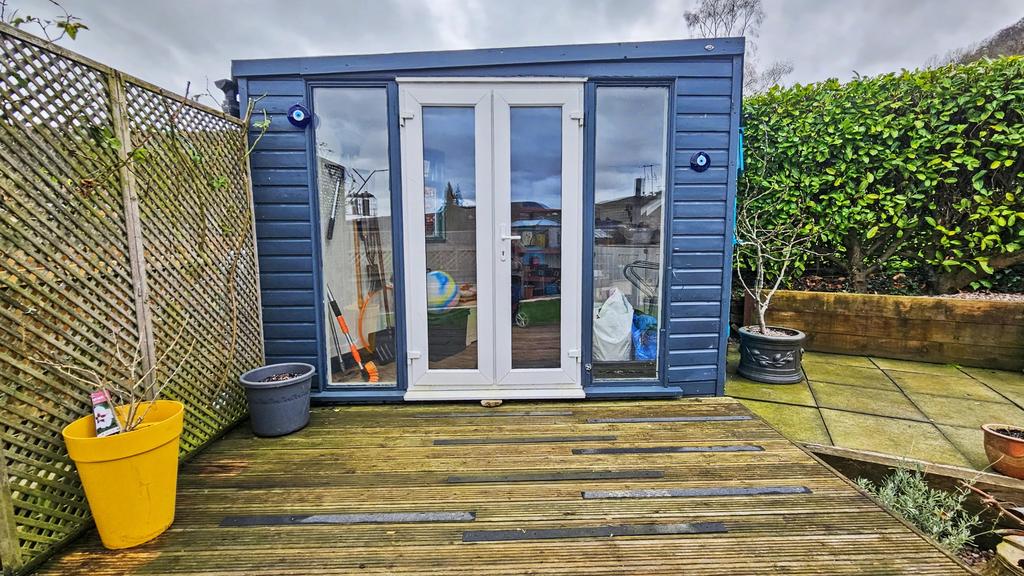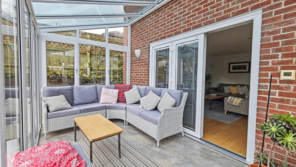 2.1m approx)(13'4" x 7'8"m approx) with stone tiled floor, UPVC double glazing, two wall lights, four power points, and triple bi-folding glazed doors to both the patio and garden.