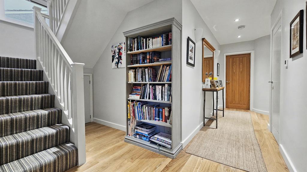INNER HALLWAY with engineered oak flooring, ceiling spotlights, understairs storage cupboard, four power points, and cupboard housing the 'Tempest' hot water cylinder.