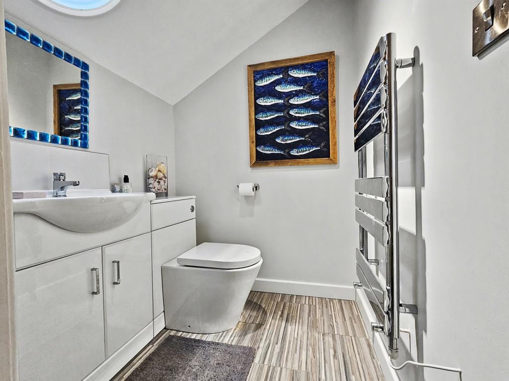 CLOAKS/WC with stone tiled floor, white suite with white panelled bath, washbasin with tiled splashback and cupboard below, and WC. Heated towel rail that can be operated independently of the heating system, window, and ceiling spotlights.