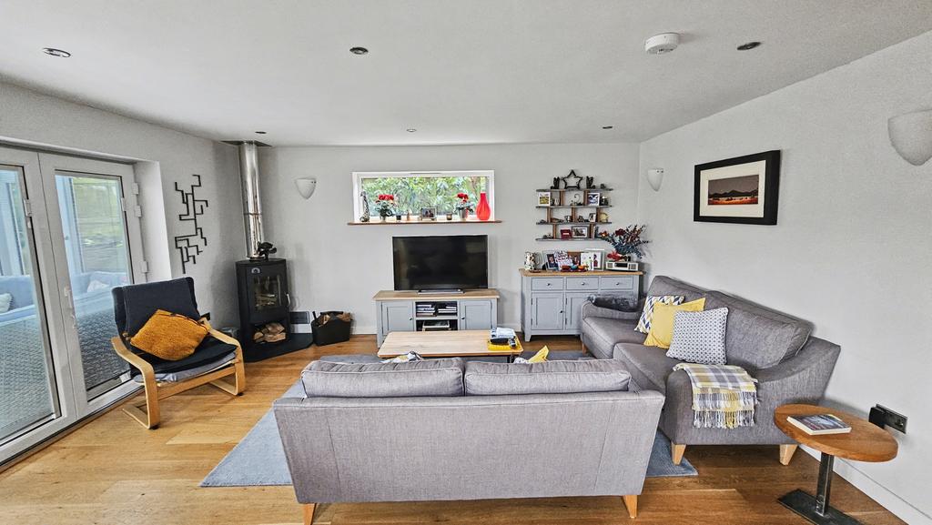 SITTING ROOM AREA with ceiling spotlights, corner wood burner on stone hearth, window, four wall lights, TV aerial point, ten power points, door to inner hallway, and triple fully glazed bi-folding doors with internal blinds leading to the conservatory.