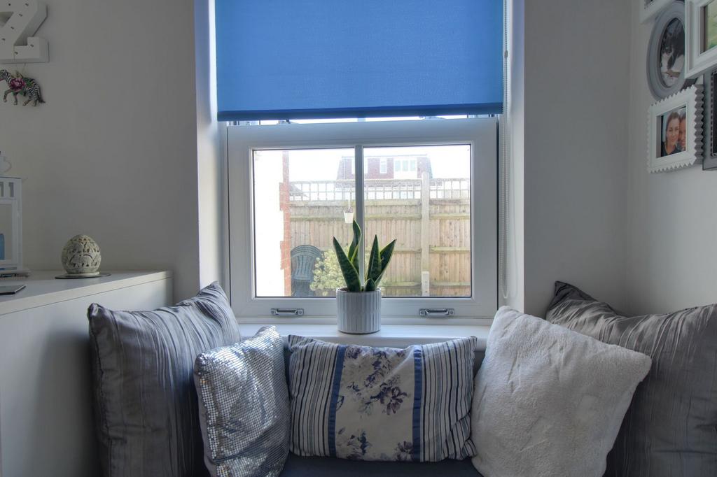 The contemporary fitted L-shaped kitchen is well-appointed with integrated appliances, including a fridge, oven, hob, and extractor hood, and flows seamlessly into the sitting room. This spacious sitting room, featuring high ceilings and a charming bay window with folding shutter blinds, enjoys easterly views, perfect for morning sunshine.