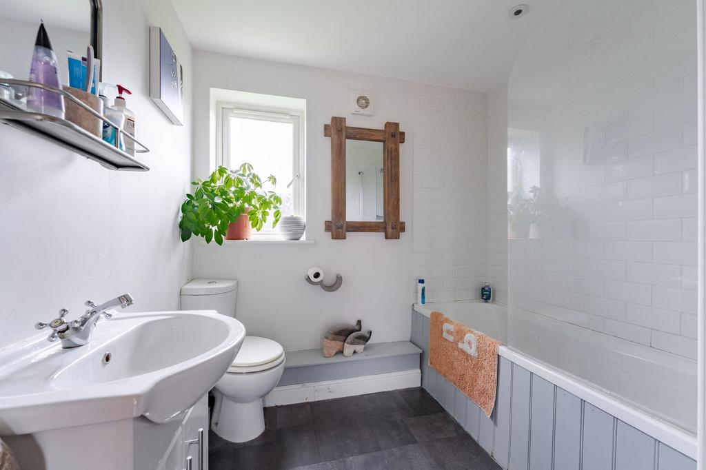 - Family bathroom with bath and shower over, linen cupboard, and loft access