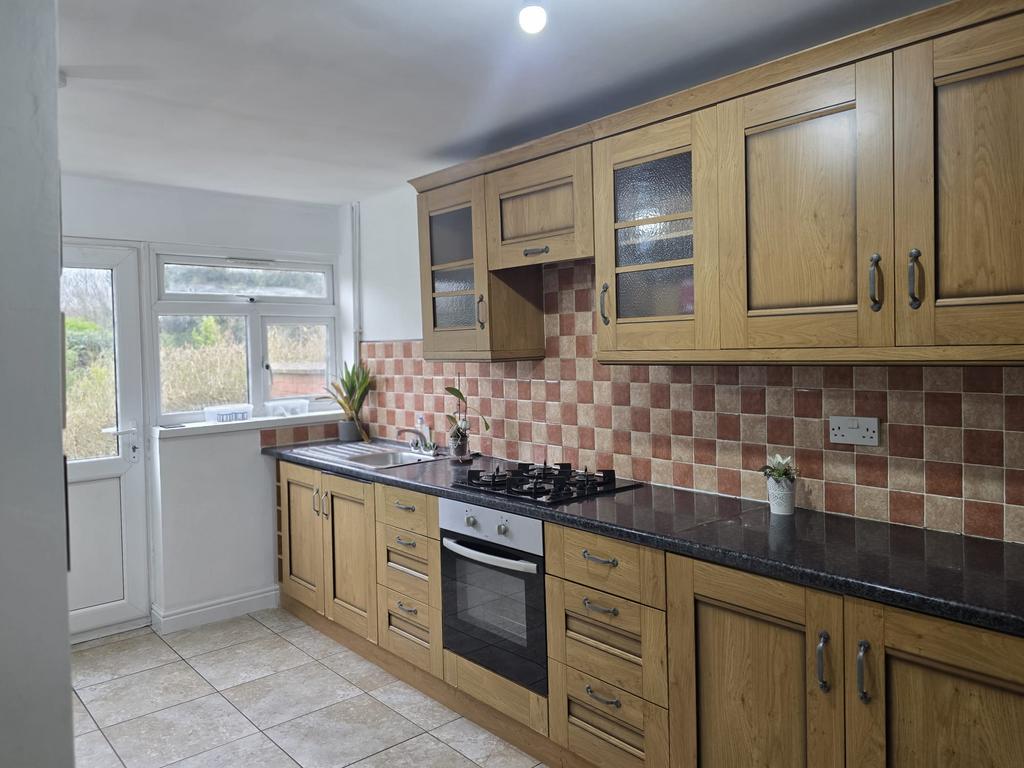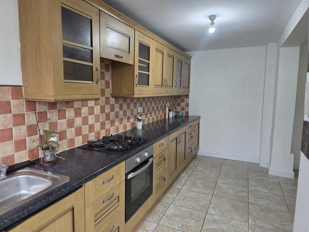 Fitted Kitchen: Size 1.97m x 4.94m (6’05” x 16’02”). Power Point. Double Glazed Window overlooking Rear. Having a range of wall mounted cupboards. Floor standing cupboards. Work Surface. Sink Unit. Fitted Gas Cooker Point. Plumbed for Washing Machine. Central Heating Radiator. Access to Rear Garden.