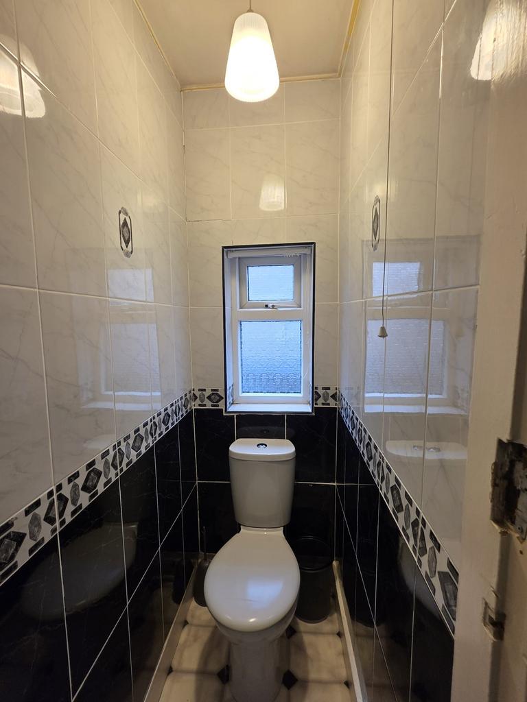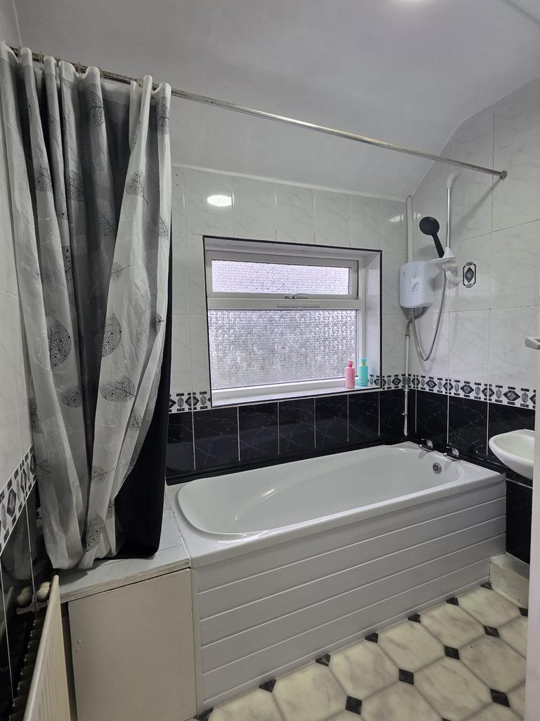 Bathroom: (Tile): Double Glazed Window overlooking Rear. Having panelled Bath. Pedestal Wash Basin. W.C. Shower unit. Shower Curtains. Central Heating Radiator.