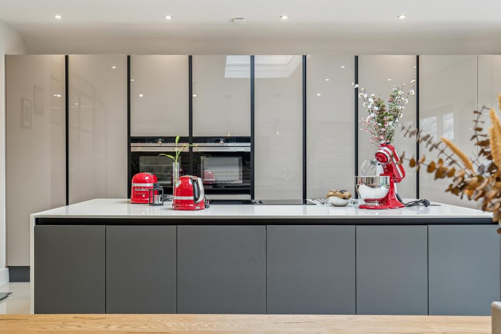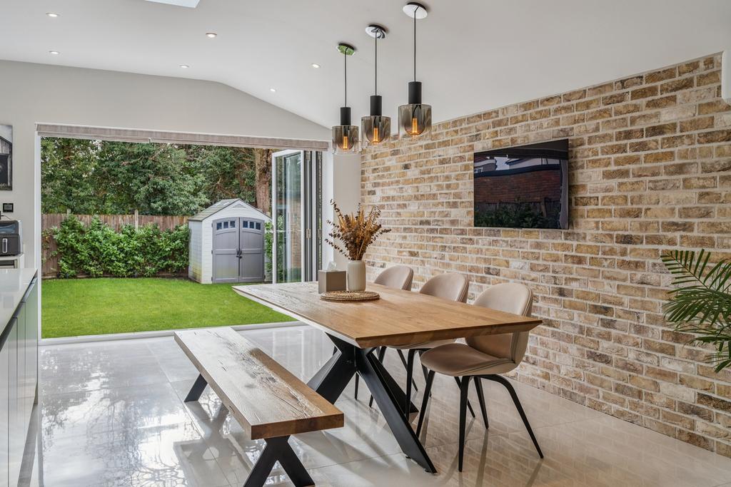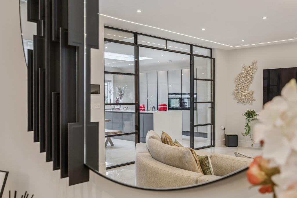 The property comprises an impressive reception room that is central to the home, with adjoining glass-panelled doors to access a superb kitchen / diner. The kitchen features bespoke units with integrated appliances and ample storage space, with the addition of a kitchen island. Amongst the units is a set of 'hidden' doors that lead to additional storage space and a guest WC, as well as side access to the garden. Bi-folding doors off the dining area opening out to the garden, ideal for the summer months.
