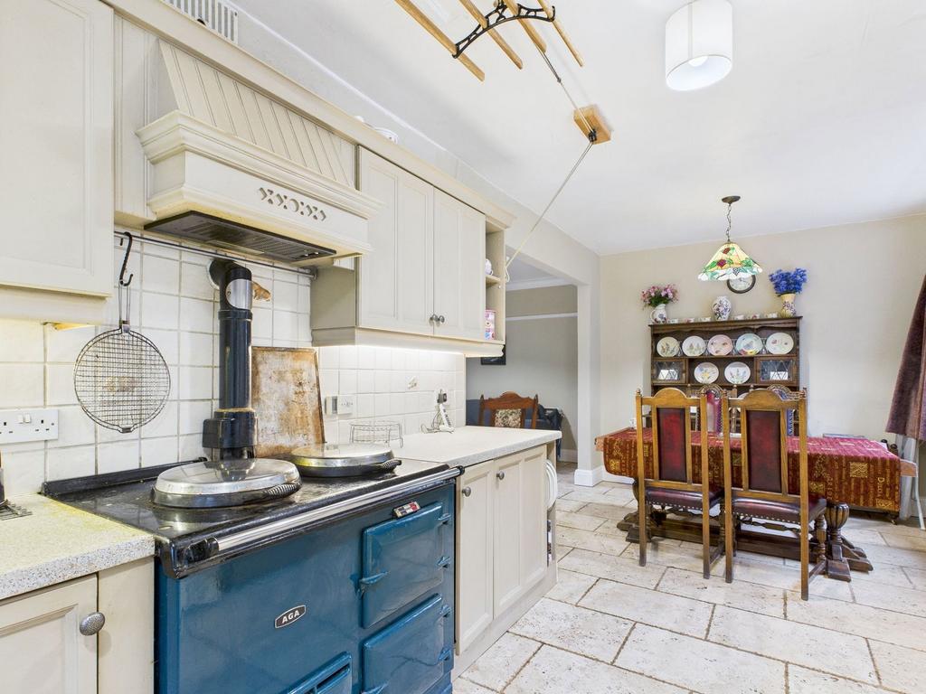 A generously proportioned open plan kitchen, dining and social living space, forming a light and airy triple aspect room. The kitchen is fitted with an extensive range of wall and base units and shelving units with ample work surfaces, incorporating a one and a half bowl stainless steel sink with mixer tap. Features include a gas fired AGA with extractor, plumbing for a washing machine, dishwasher and a concealed boiler. Marble style flooring runs throughout the space, complemented by a multi fuel stove set on a slate hearth. Double patio doors provide direct access to the rear garden.