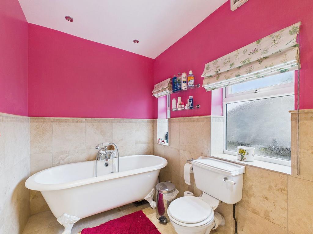 A generous bathroom fitted with a four piece white suite comprising a claw foot bath with shower attachment, corner shower cubicle, WC and vanity wash hand basin. The room is fully floor tiled with partially tiled walls and benefits from an extractor fan and electric underfloor heating.