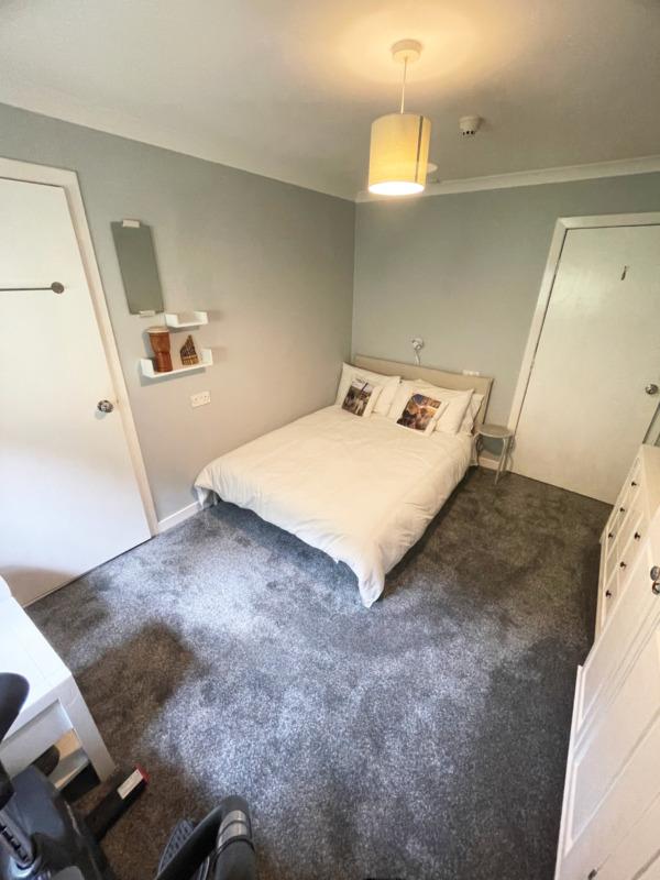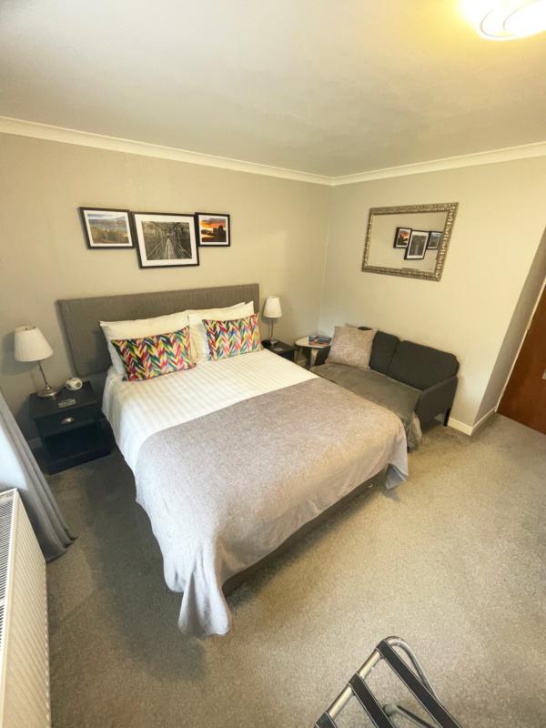 Spacious double room fitted with quality carpet flooring, TV point and charging points. Seating area. Radiator.