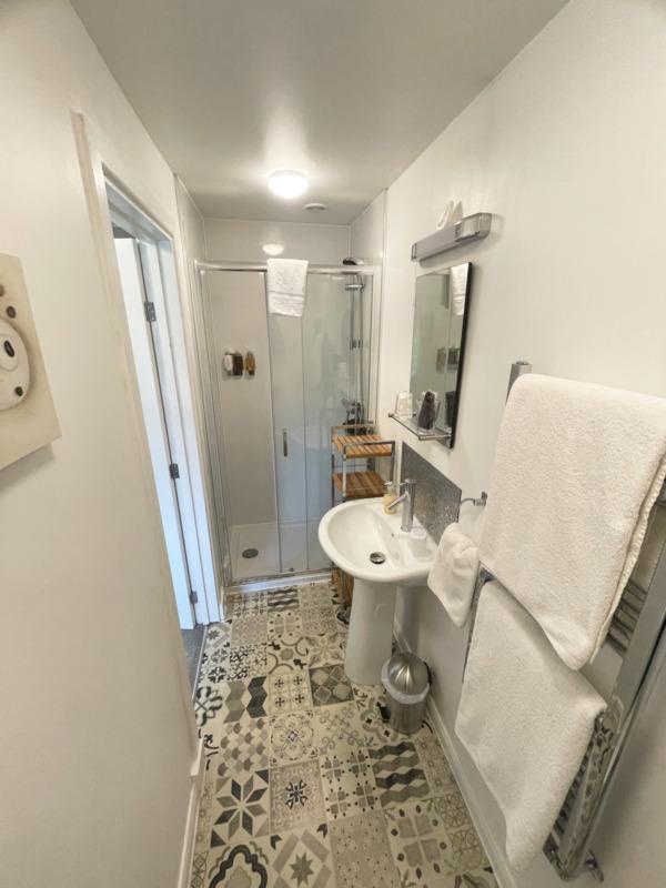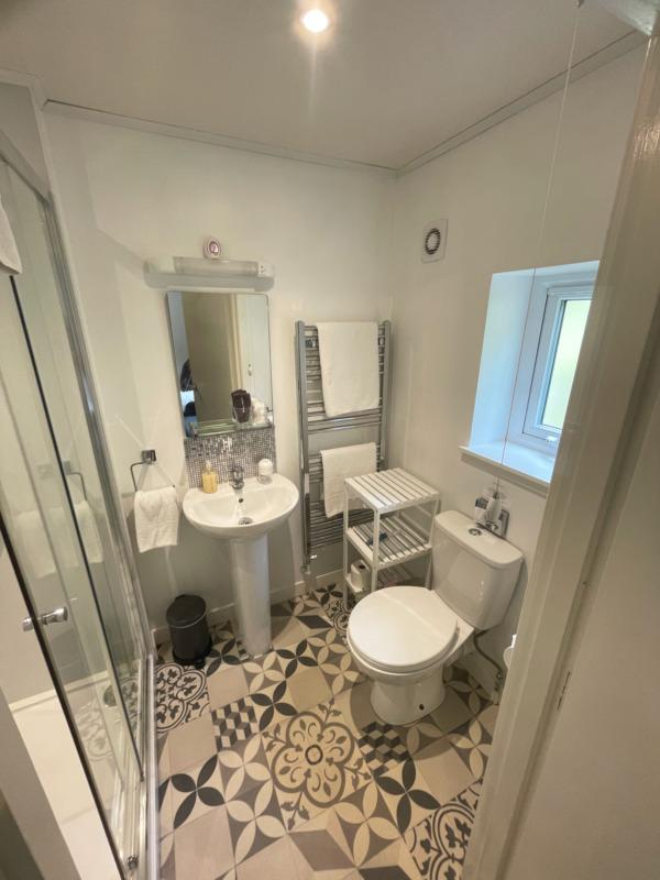 Shower with partially tiled walls and floor, heated towel rail, wash hand basin , W.C.