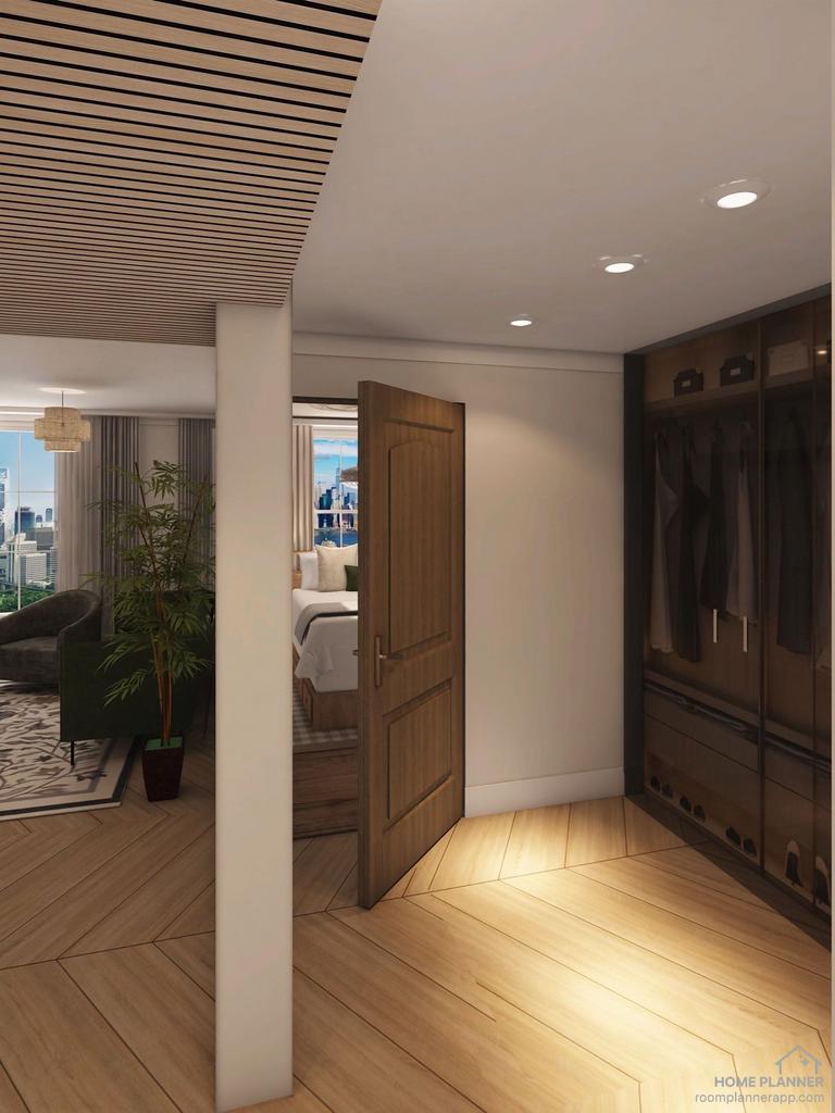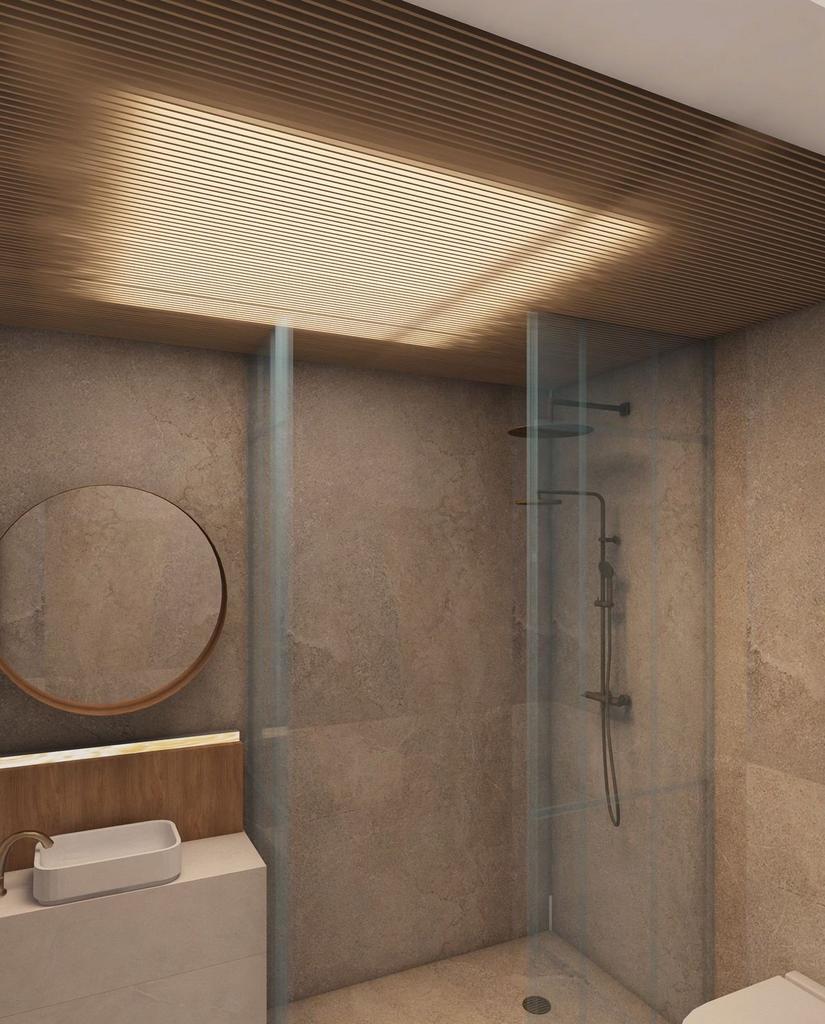 The bathroom is finished in elegant, concrete-effect tiles with a walk-in rain shower, a floating vanity unit, and modern fixtures. The use of wood slats on the ceiling adds a refined, spa-like atmosphere to the space.