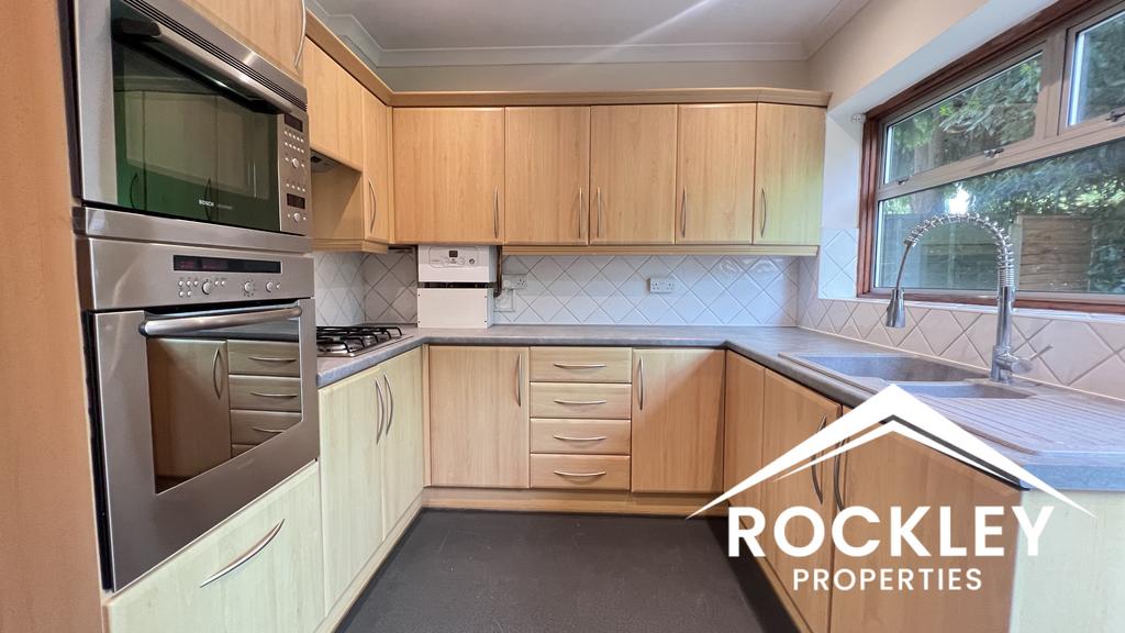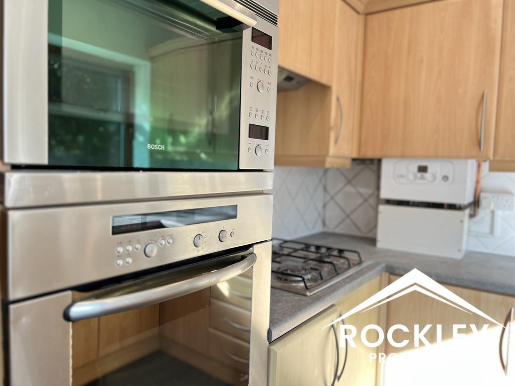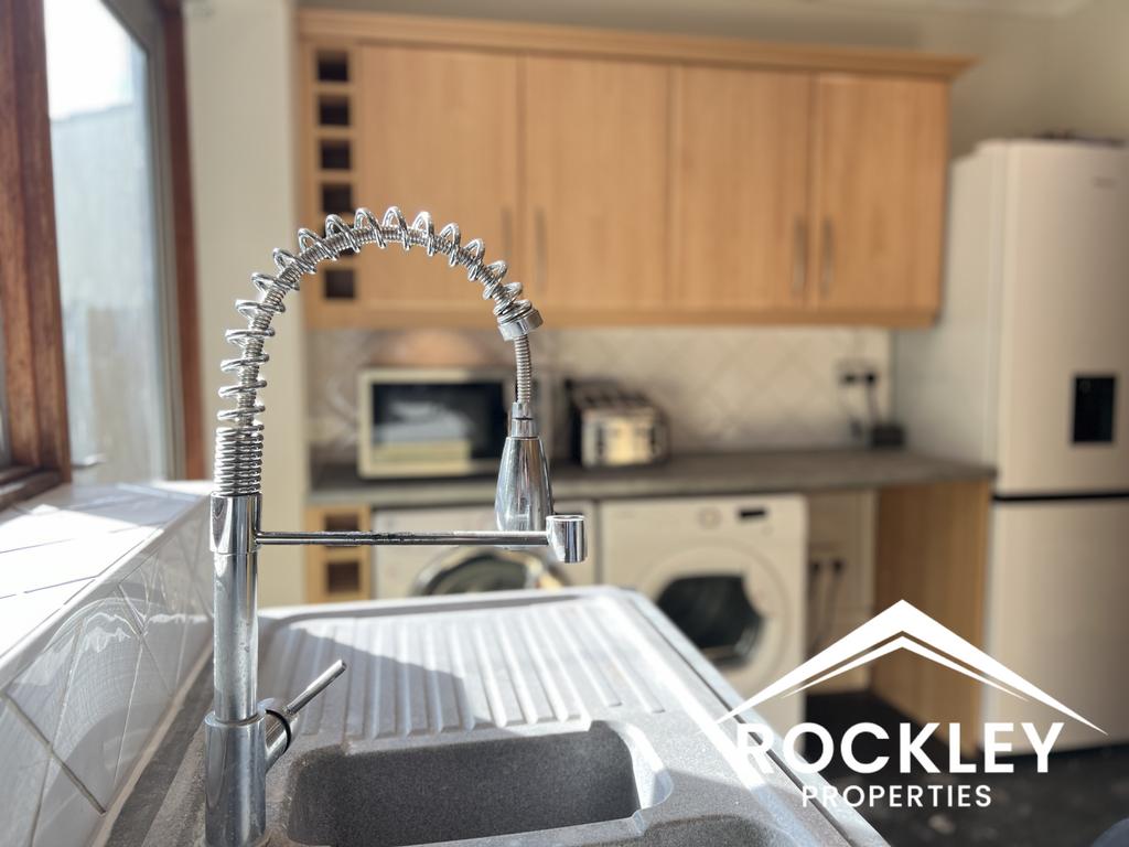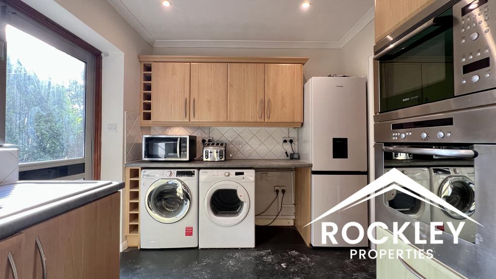 Large kitchen with a full size fridge freezer, fitted oven and grill. Separate washing machine and dryer.