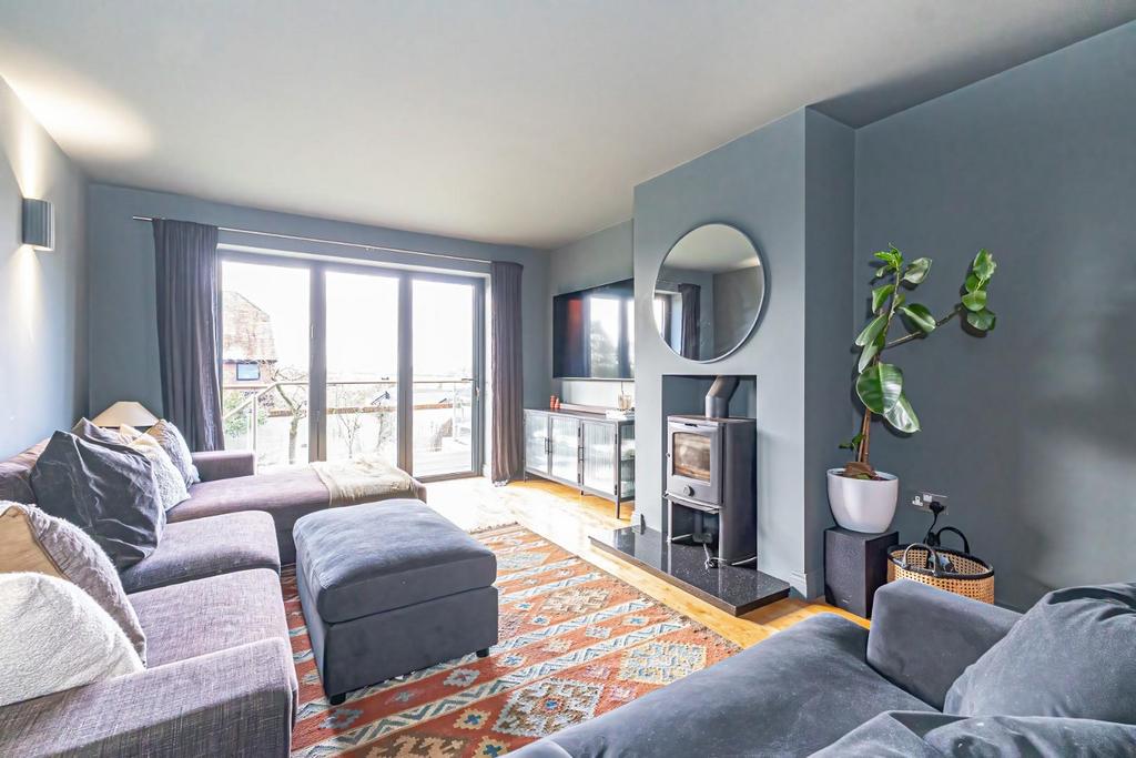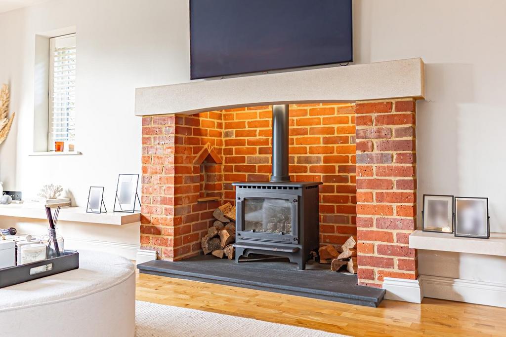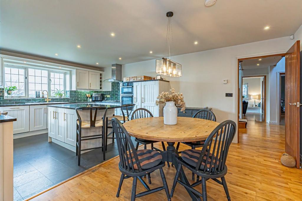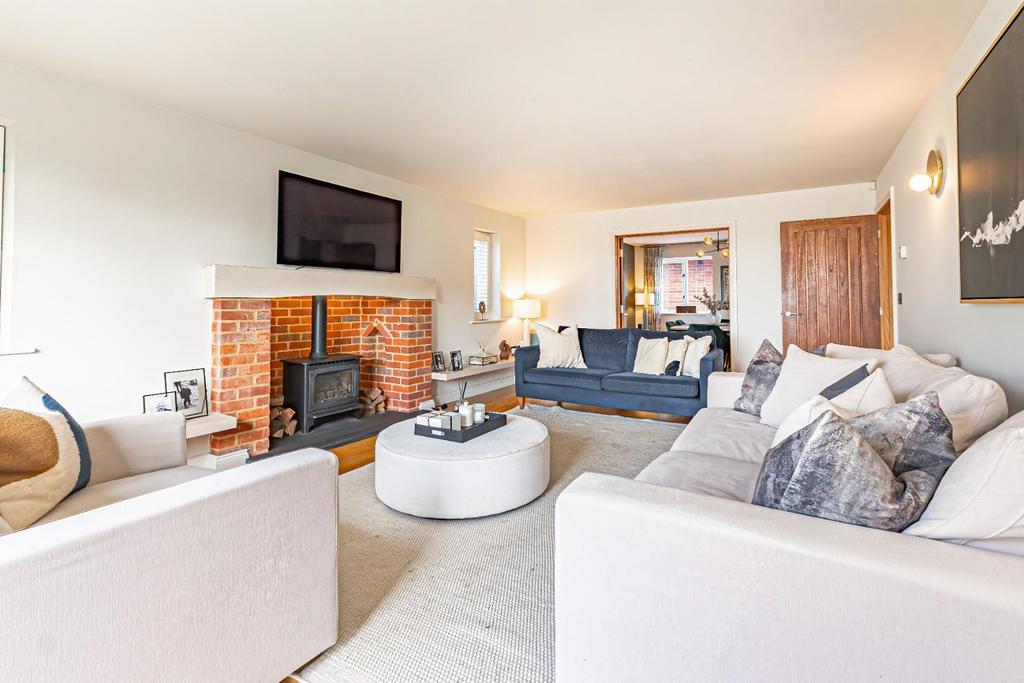 The ground floor offers generous and flexible living space, ideal for entertaining and family life. The main living room is filled with natural light and features bifold doors opening onto a raised terrace with far-reaching countryside views. A characterful inglenook fireplace with log burner-style gas fire forms a striking focal point, while double doors connect to a spacious dining room for either open-plan or more formal living. A separate family room adds flexibility, featuring large glazed doors, it opens directly onto the rear garden.