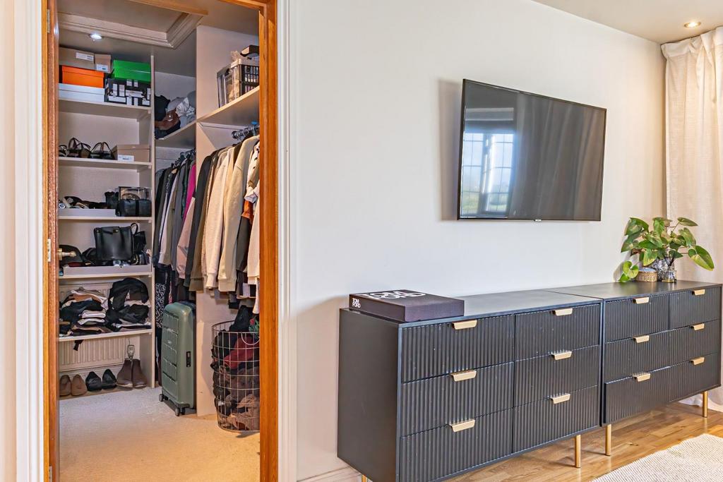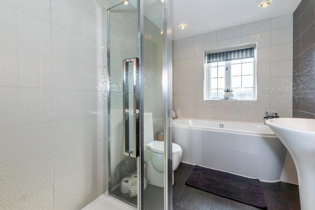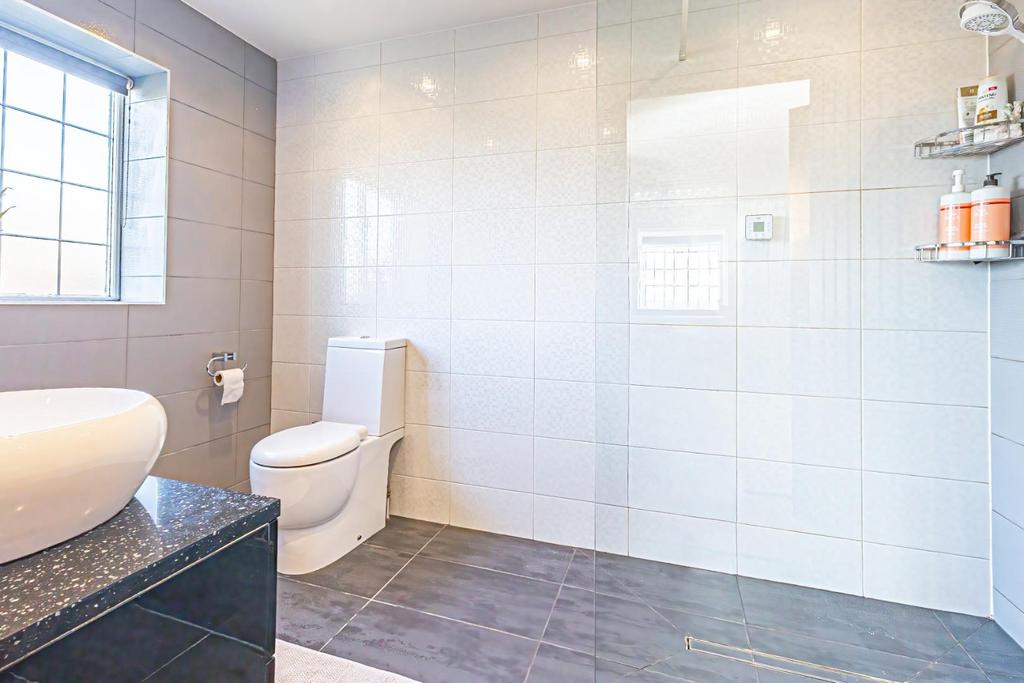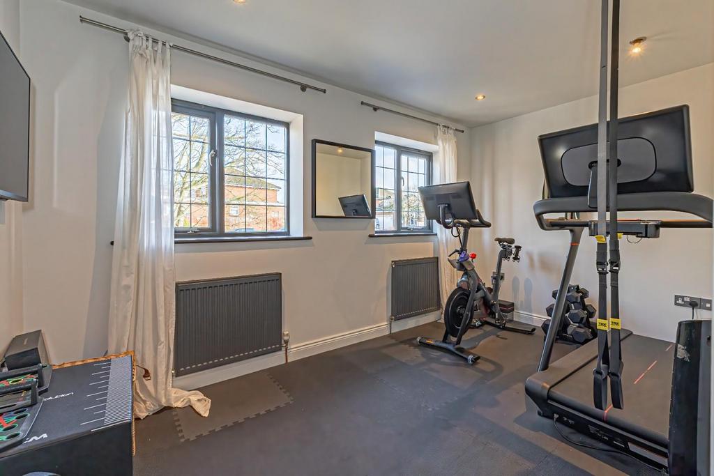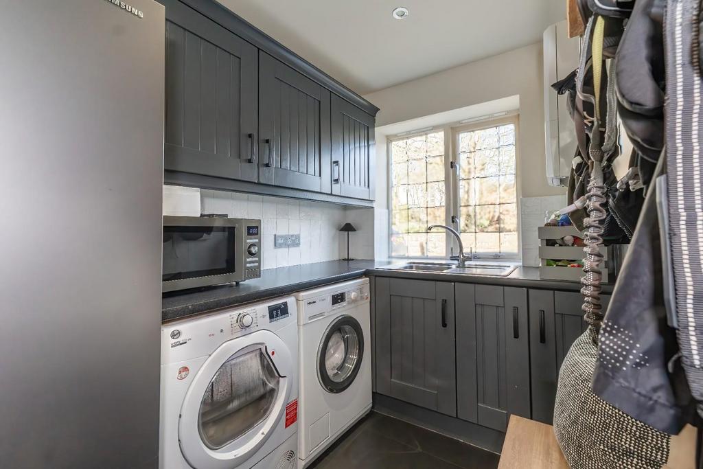 At the heart of the home is the impressive kitchen/breakfast room, fitted with extensive cabinetry, sleek black stone worktops and a central island with breakfast bar seating. Integrated appliances and ample dining space make this a true family hub. The kitchen flows into a stunning garden room with vaulted ceiling, skylight and patio doors opening onto the garden. A utility/boot room, home office and refitted cloakroom complete the ground floor.