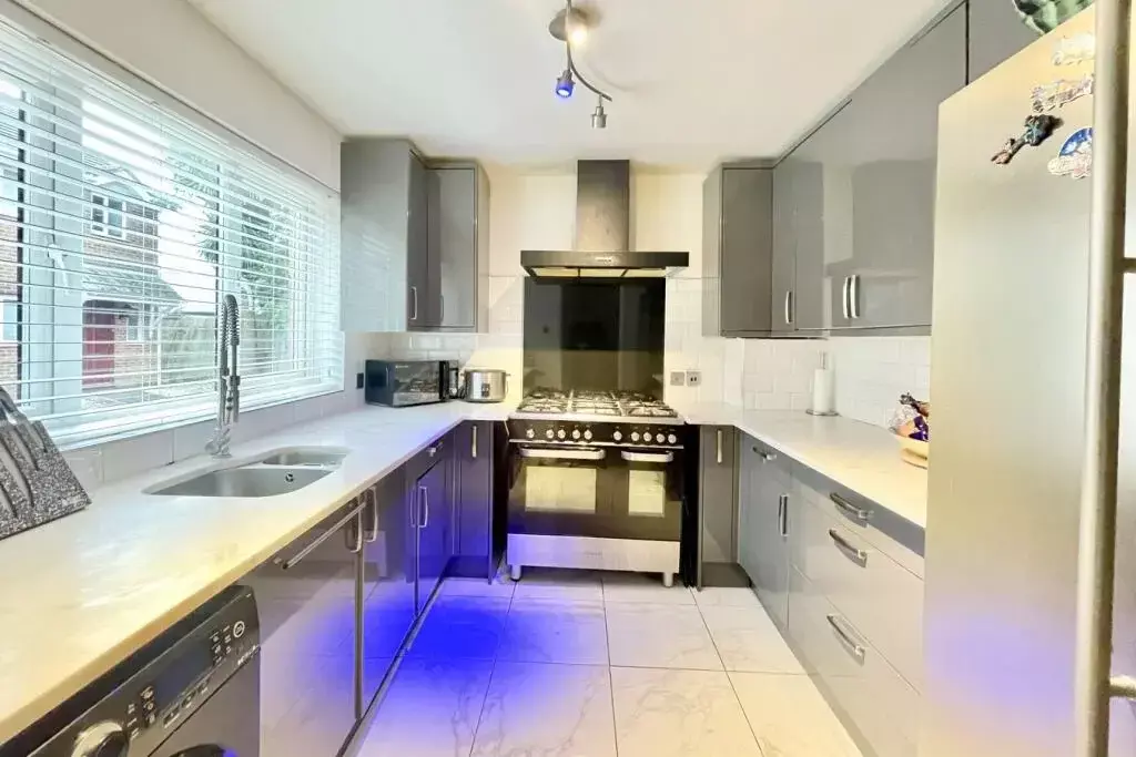 The kitchen is modern and well presented, featuring a range of high-gloss units providing ample storage, complemented by generous worktop space and tiled flooring throughout. The kitchen overlooks the front of the property, allowing plenty of natural light to fill the room. There is also space for a fridge/freezer and a washing machine.