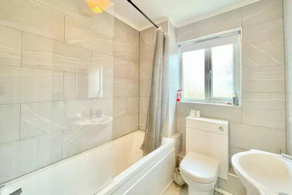The bathroom is modern and well presented, comprising a panelled bath with shower over, WC and wash basin. The room is finished with contemporary tiled walls and flooring, creating a clean and stylish look.
