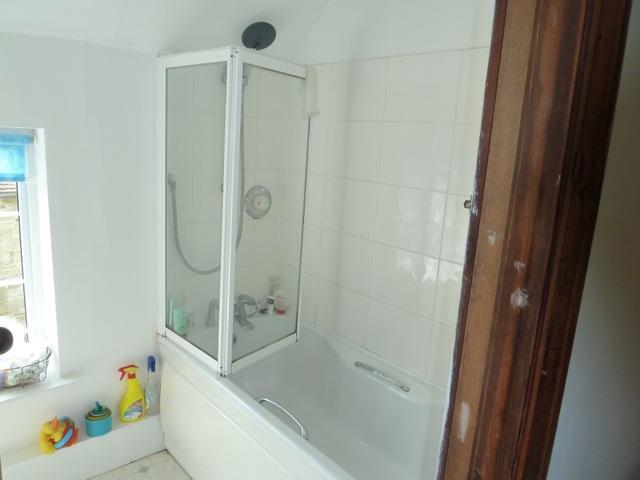Family bathroom with bath, overhead shower, WC and handbasin.