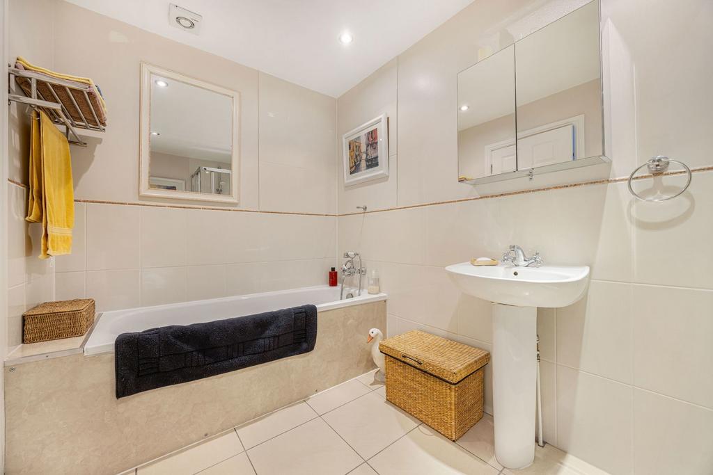 The kitchen/breakfast room has been thoughtfully arranged with contemporary units, integrated appliances and a breakfast bar, creating a practical yet sociable space. The principal bedroom is particularly impressive in scale and presentation, enhanced by an elegant bay window overlooking the communal gardens, high ceilings and a calm, refined atmosphere. This room further benefits from a well-appointed en suite bathroom fitted with both a bath and a separate shower. Two further bedrooms offer excellent flexibility for guests, home working or additional family accommodation, served by the remaining bathroom facilities, all finished to a high standard.