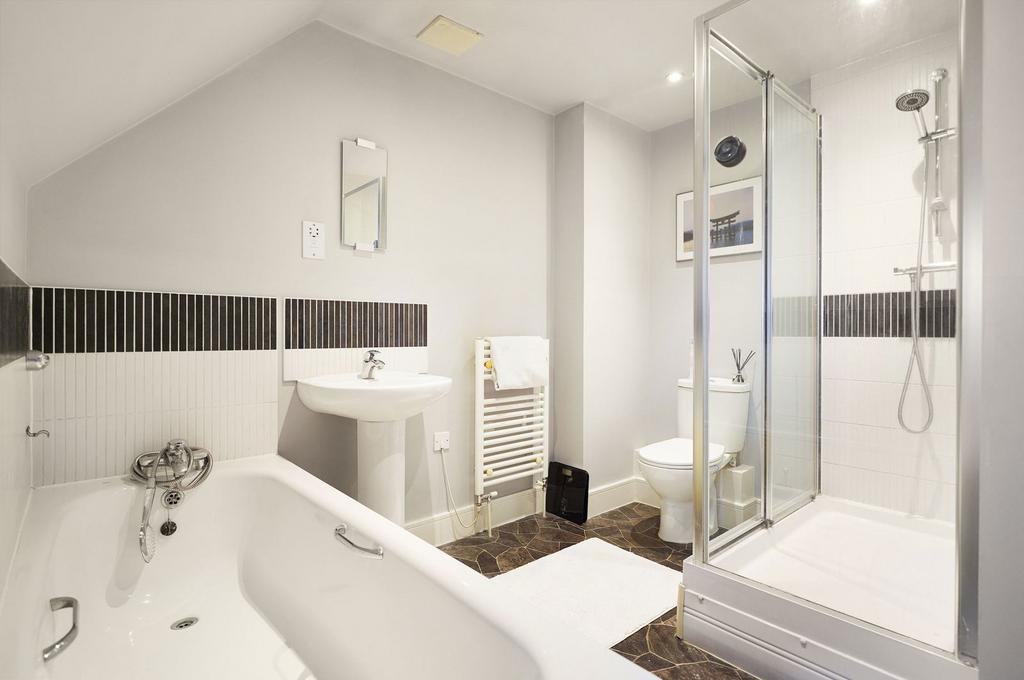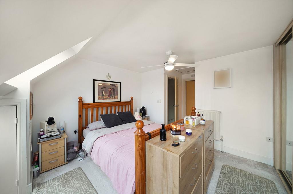 An impressive primary bedroom awaits on the top floor, which boasts exceptional integrated storage, further eaves storage, and an en-suite bathroom with full size bath and seperate shower. There is also additional storage to the eaves, and the room is further enhanced by the addition of Velux windows.