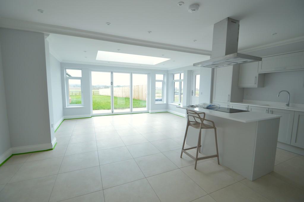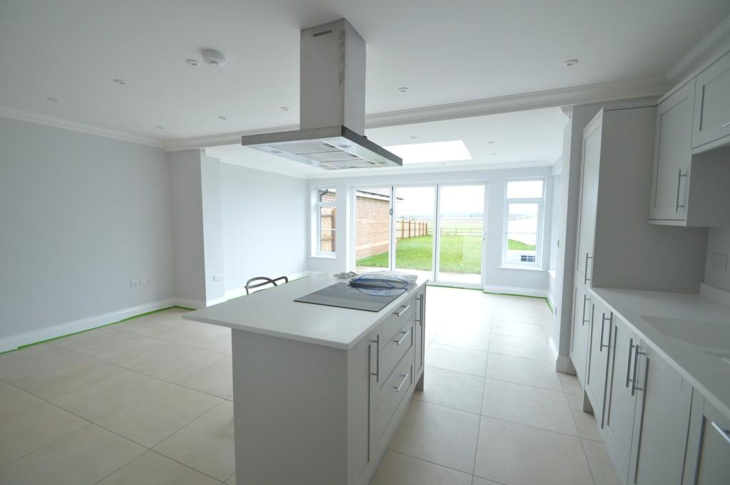 The porch leads to a panelled front door which opens to the impressive reception hall which has a tiled floor, stairs rising to the first floor with oak handrails, and oak doors off to the principal reception room. There is a useful understairs storage cupboard, and a lavishly appointed ensuite cloakroom with a vanity unit, rectangular sink, matching WC and a tiled floor. The principal reception room is to the front of the property and has a dual aspect and is of a generous size. An oak door opens to the stunning kitchen/breakfast/family room which has bifold doors to the rear giving wonderful views to the garden and across open fields beyond. There is an impressive roof lantern which makes for a beautifully light informal family entertaining space and a glazed back door leading to the side. The kitchen is particularly well appointed with a range of shaker style units with quartz work surfaces and upstands and integral appliances to include a fridge/freezer, oven and separate grill, dishwasher and there is an impressive island unit with hob and extractor hood above and a breakfast bar for entertaining purposes. The floor is fully tiled and a door leads to a well-appointed utility room which is fitted with the same work surfaces and units as the kitchen with a sink, mixer tap and space for a tumble dryer and washing machine.