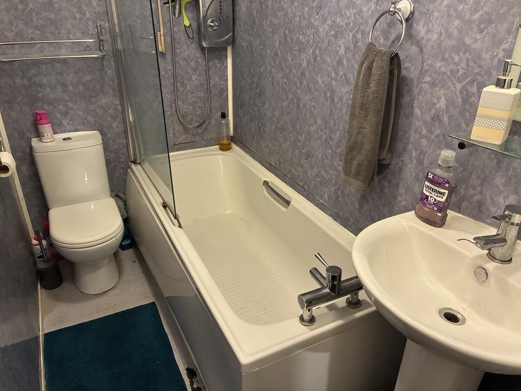 Bathroom 3 piece suite comprising panel bath with shower over, pedestal hand basin and low level wc. heated towel rail and extractor fan.