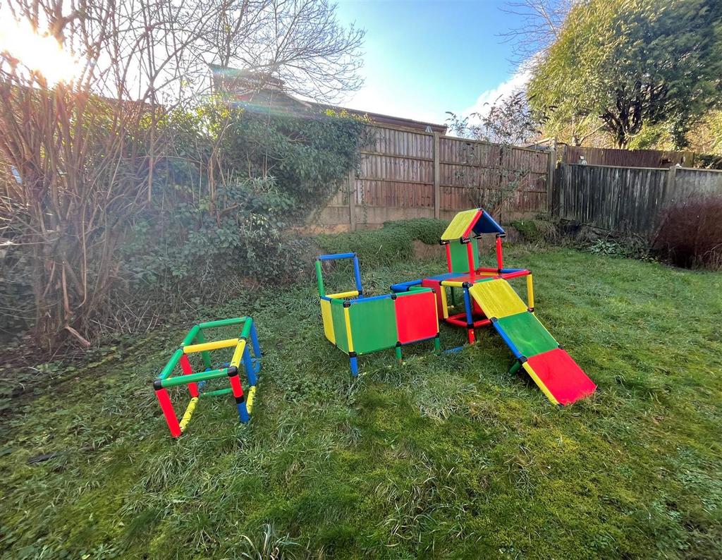 The rear garden is well enclosed by wooden fencing and enjoys a sunny aspect. Immediately outside the sitting room is a paved patio with outside light and tap. Steps lead down to a further ‘sunken’ paved area which also provides access to the garage. Beyond the main patio is a sloping area of lawn and screened deck area which currently accommodates two garden sheds.