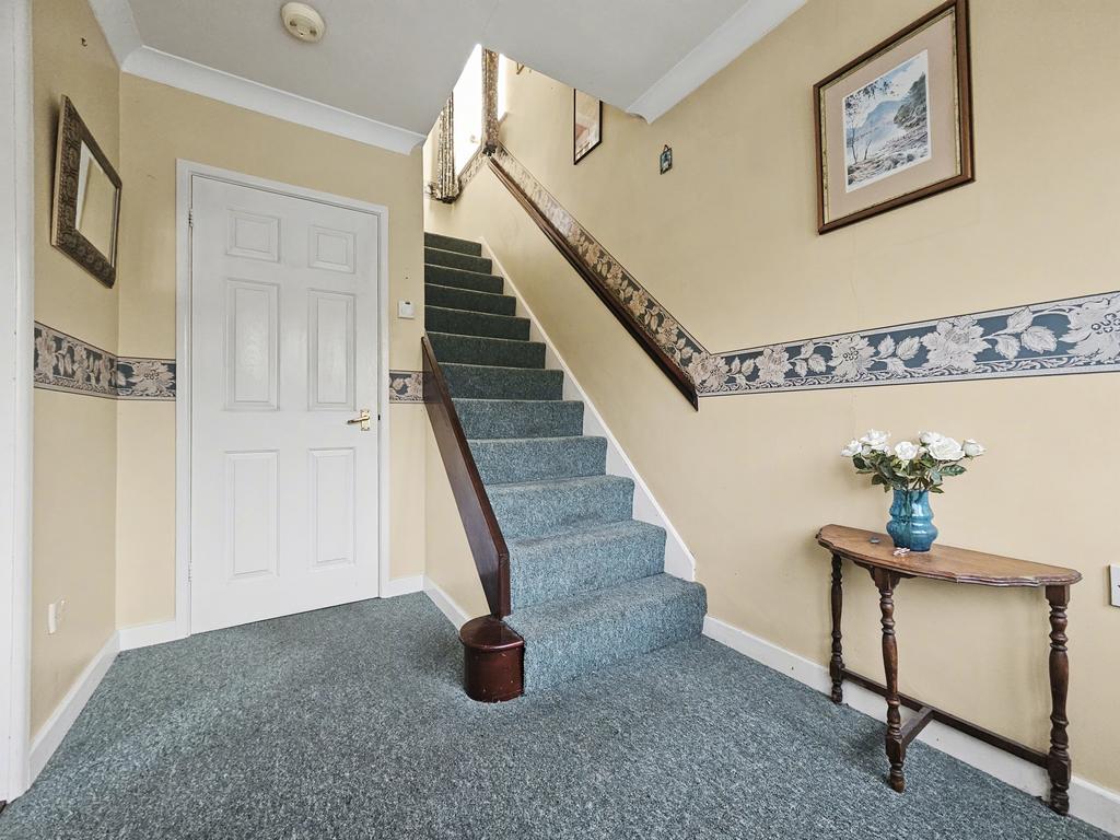 UPVC glazed front door with side windows to RECEPTION HALL With fitted carpet, coving, radiator, two power points, large understairs cupboard, and STAIRCASE with fitted carpet and handrail ascending to the first floor.