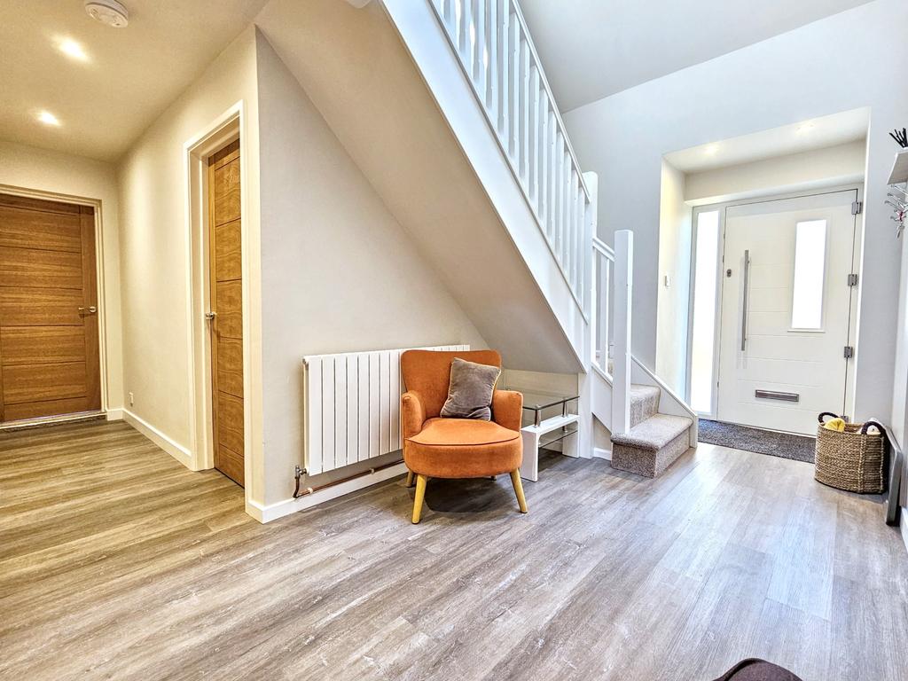 UPVC part glazed front door to RECEPTION HALL with wood laminate flooring, radiator, ceiling spots, and three power points.