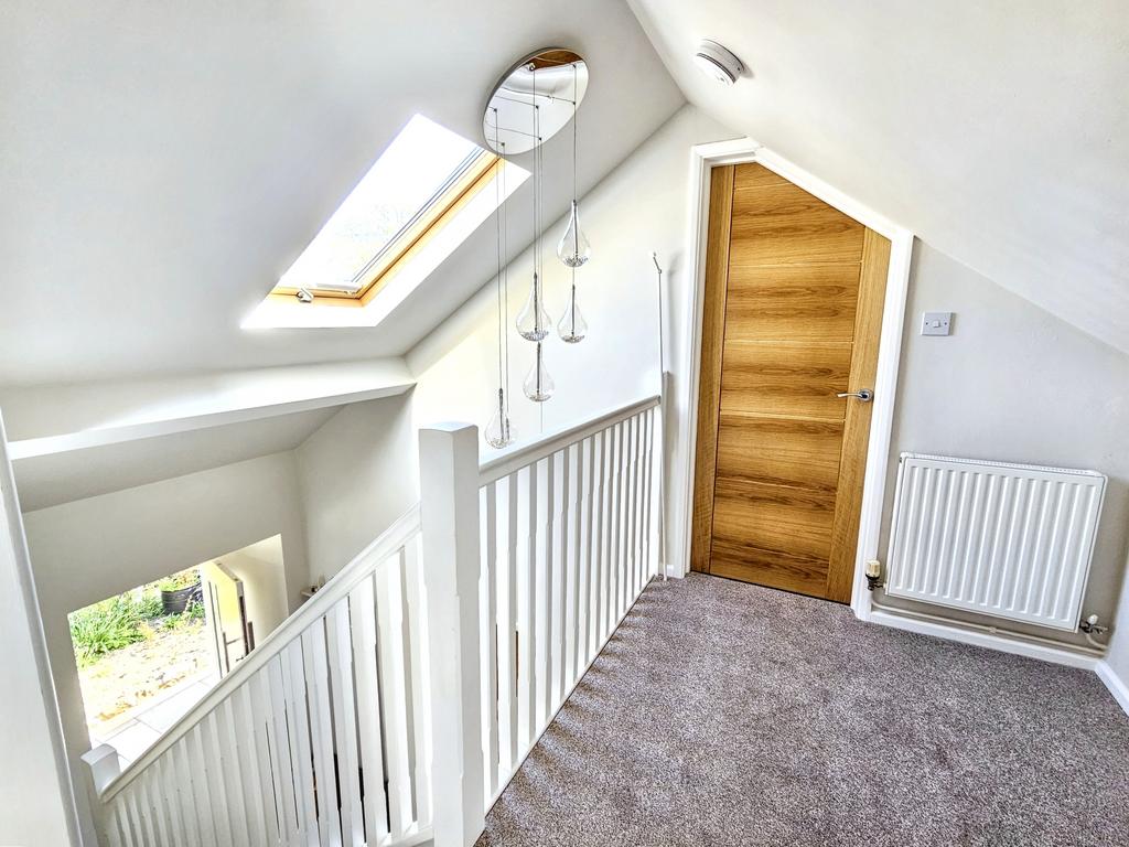 Balustrade STAIRCASE with fitted carpet to First Floor LANDING with fitted carpet, radiator, skylight window, and access to eaves space.