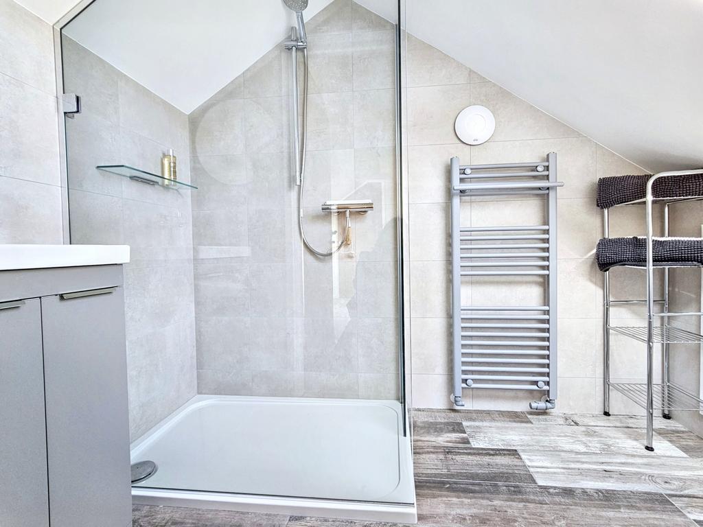 En-suite SHOWER ROOM with laminate flooring, fully tiled walls, heated towel rail, extractor fan, and white suite with walk-in shower, WC and washbasin with cupboard below, and wall mirror and access to eaves space.