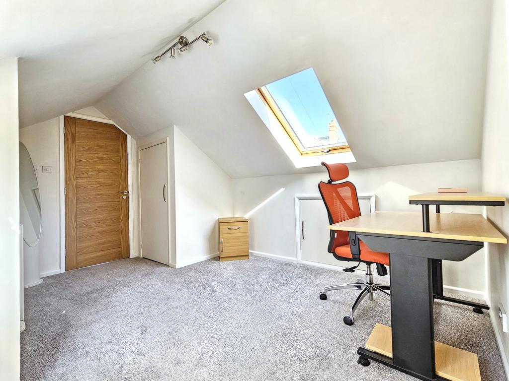 BEDROOM 3 (3.9m x 3.2m approx)(12'7" x 10'4" approx.) with fitted carpet, two skylight windows, radiator, four power points, two store cupboards, access to eaves space, and door to: