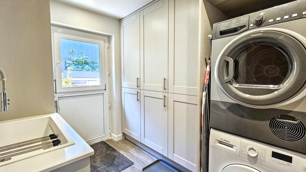 UTILITY ROOM with vinyl floor, range of cupboards with large sink, worktops, spaces for washer and dryer, radiator, floor to ceiling built-in cupboards with shelving, three power points, gas wall mounted boiler, and UPVC double glazed stable style rear door.