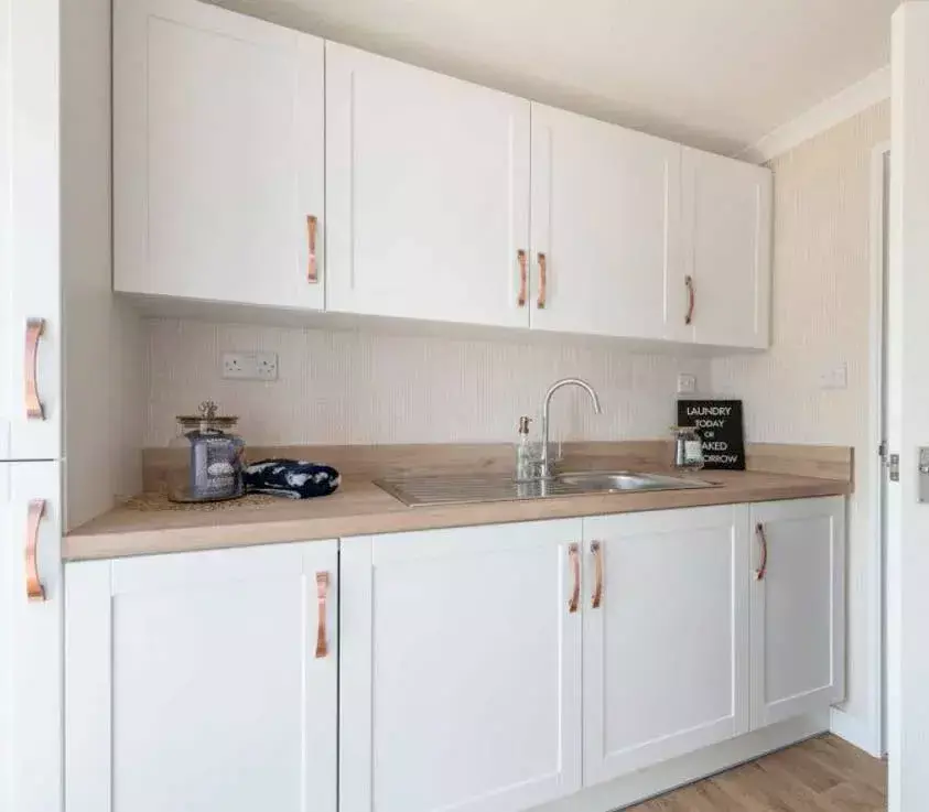 With an impressive footprint of 40 x 14, this high-specification home is fully furnished and thoughtfully designed to maximise space and natural light. Step inside to discover a soft, inviting colour scheme and quality carpeting throughout, creating an immediate sense of warmth and welcome. The flexible main living space can be configured as an open-plan ‘L’ shaped lounge and dining area, or as separate rooms to suit your individual preferences. The stylish, fully fitted kitchen comes complete with an oven, hob, and an extensive range of units, ideal for modern living and entertaining.