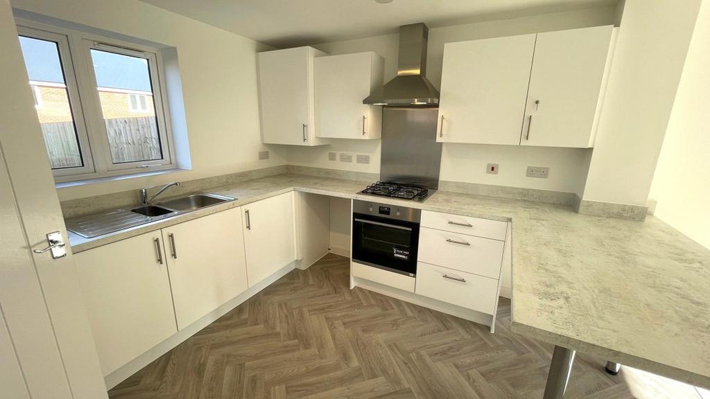 A door off the hallway leads into the open-plan living area. The kitchen, located at the rear of the home, features a range of stylish base and wall units, an integral oven and hob, an extractor fan, and a sleek stainless steel sink and drainer. There's ample space for your fridge/freezer and washer dryer and you'll also benefit from a breakfast bar.