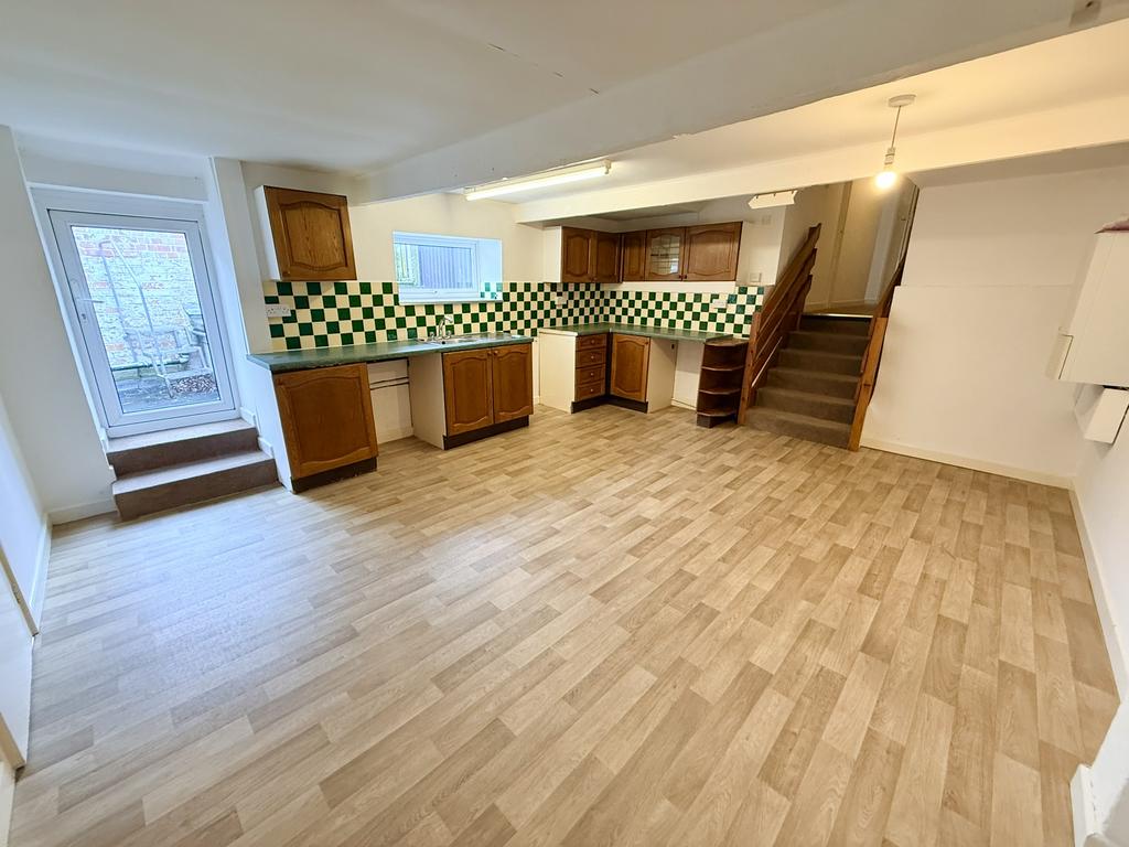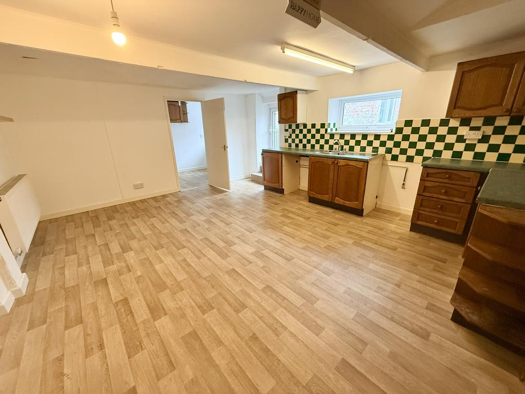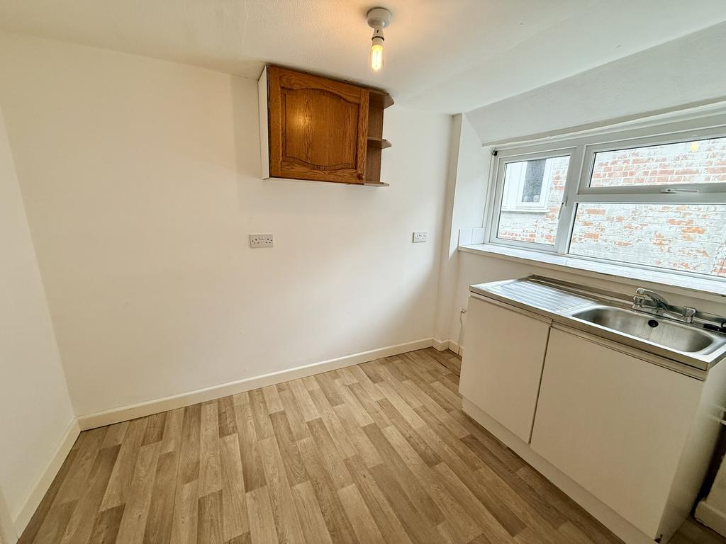 Fitted base unit with stainless steel sink and drainer, wall-mounted unit, double-glazed window to the side aspect, wood-effect vinyl flooring, and space and plumbing for a washing machine. Door to: