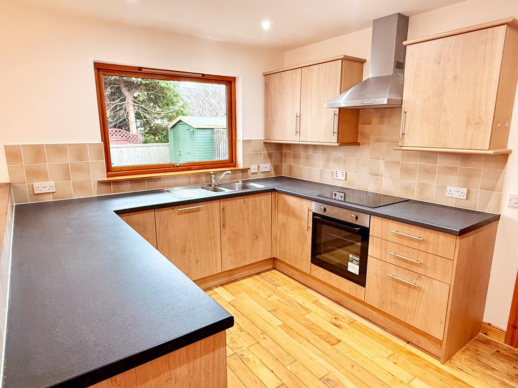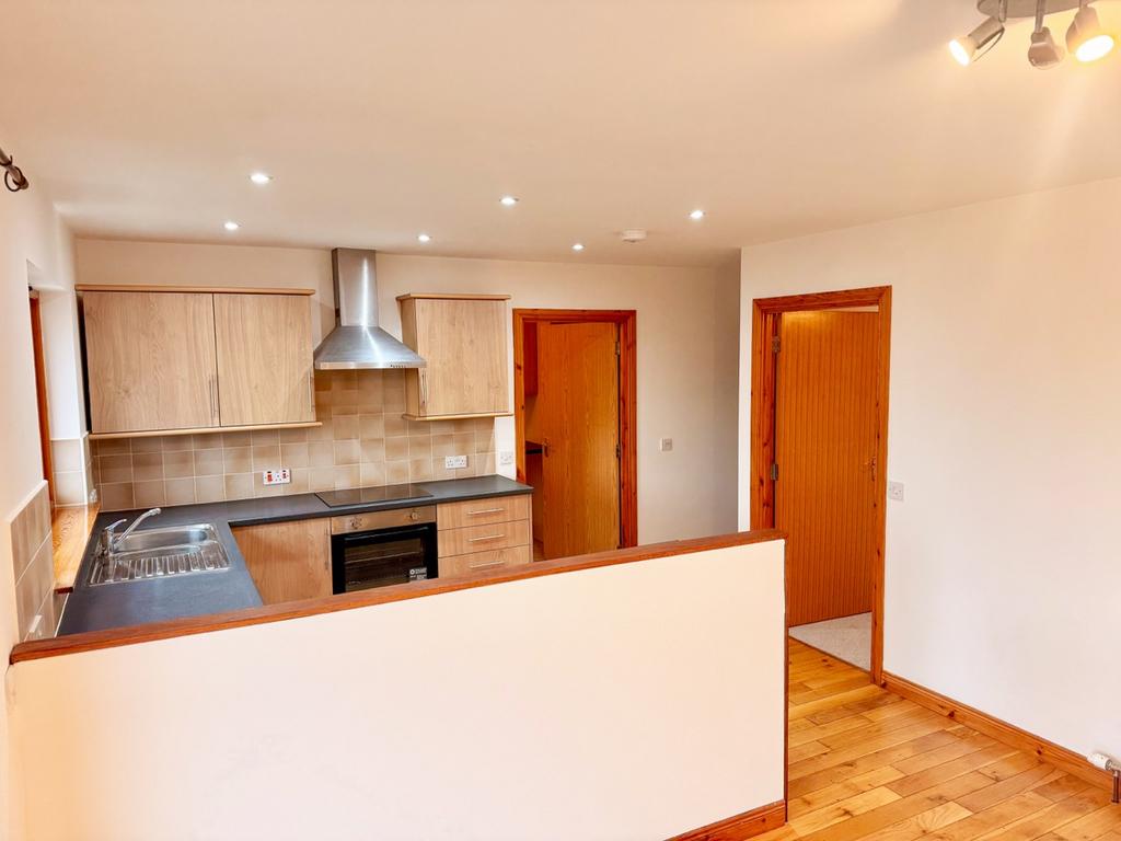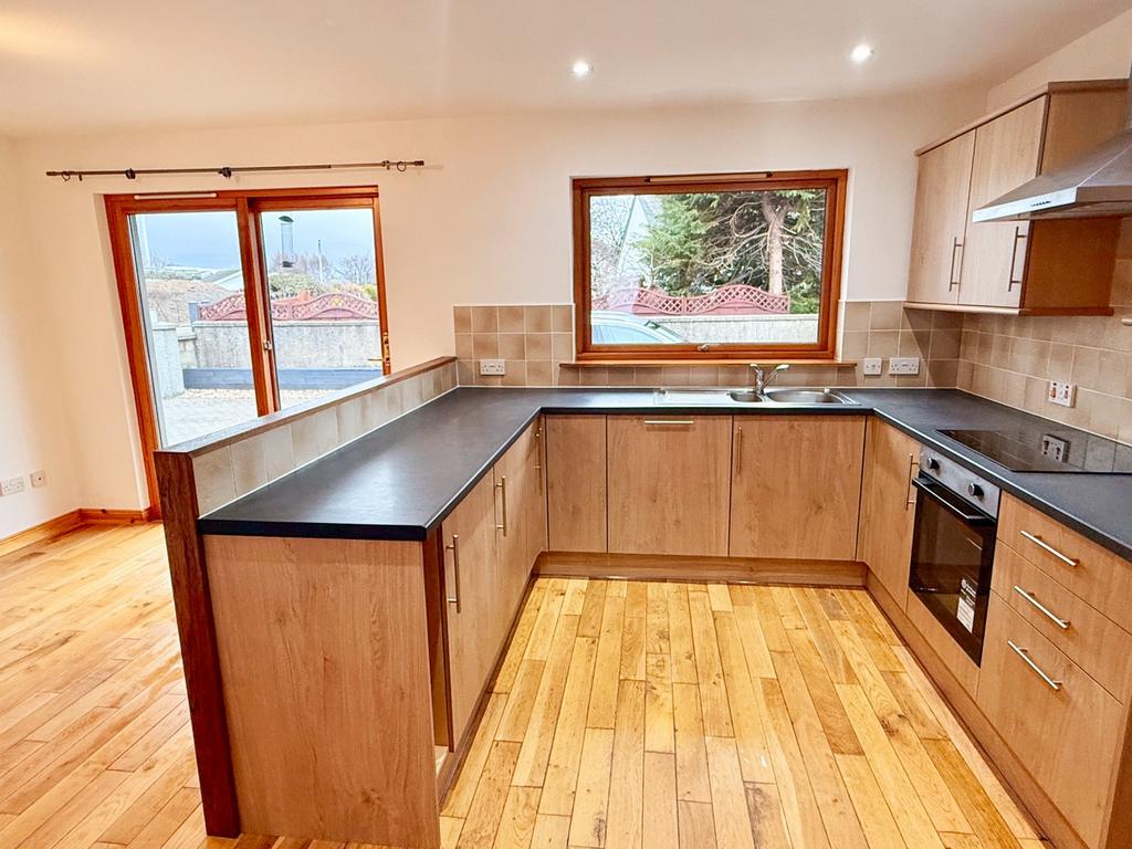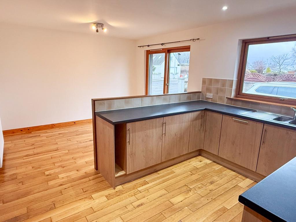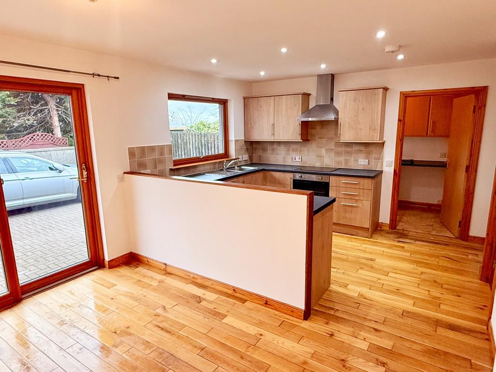 Fitted wall and base units with integrated fridge and dishwasher. Fitted electric oven, hob with extractor hood above. Tiled above the work tops. Radiator. Patio doors opening to the rear. Wooden floor.