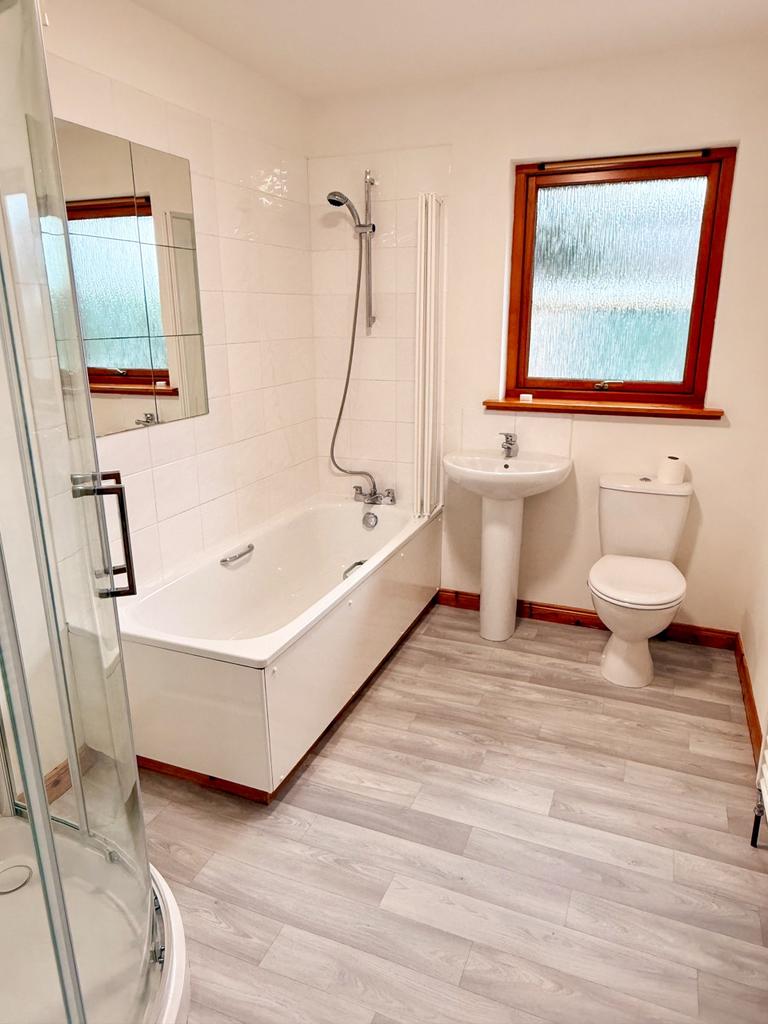 Three piece white suite with separate shower cubicle. Wet wall within shower cubicle. Tiled above the bath which has a mixer shower over and shower screen. Heated towel rail. Window to the rear. Vinyl floor covering. Extractor fan.