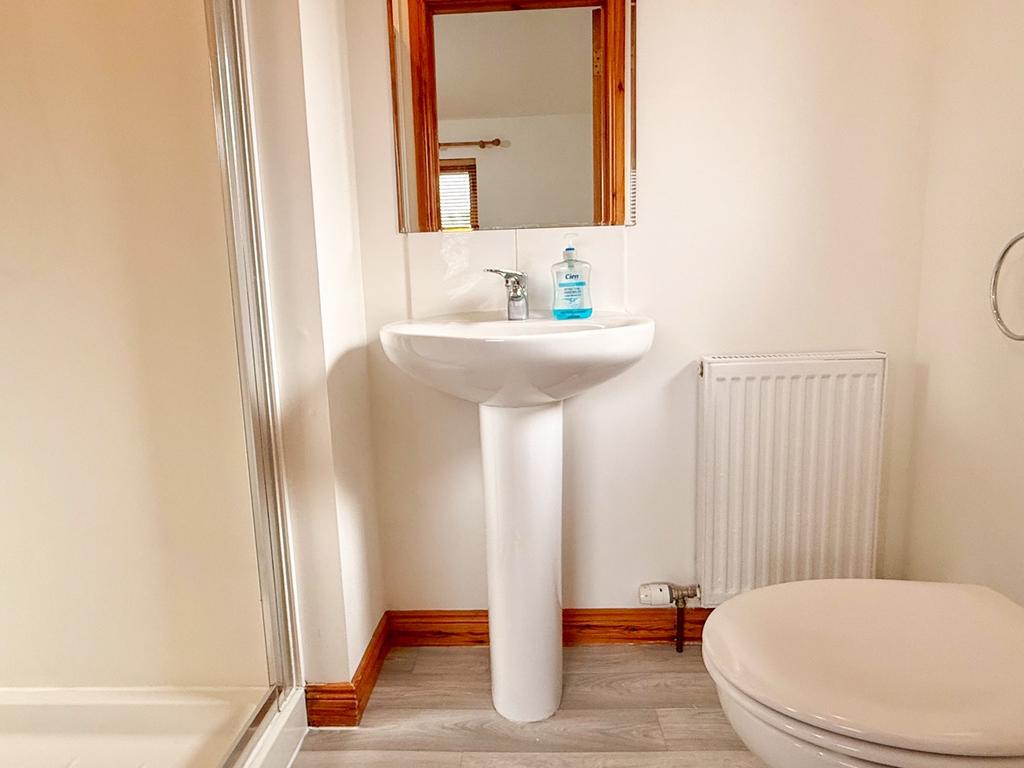 White WC and wash hand basin. Shower cubicle with wet wall panels. Extractor fan. Radiator. Vinyl floor covering. Window to the side.