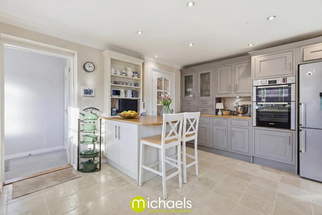 The upgraded shaker-style kitchen has been tastefully finished in dove grey and features oak work surfaces, an inset ceramic butler sink with mixer tap, breakfast bar seating, an integrated double oven, benefit of a water softener and space for additional appliances. Completing the ground floor is a bright and airy orangery, with a glazed roof and large windows, providing a wonderful space for relaxing or entertaining while enjoying views across the garden.