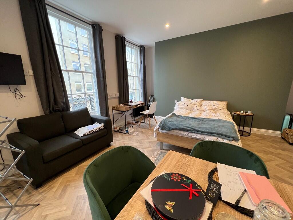 The studios are fully furnished and feature a fully fitted kitchen with an integrated fridge/freezer, electric oven, and electric hob. Each studio includes a comfortable 4ft double bed with a mattress, a wardrobe for your belongings, a flat-screen TV, a dedicated desk area for studying, and an ensuite shower room for your privacy and convenience.