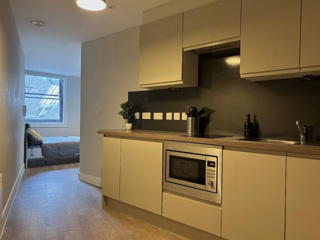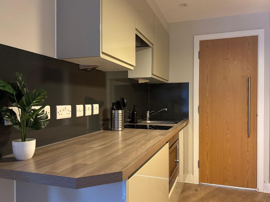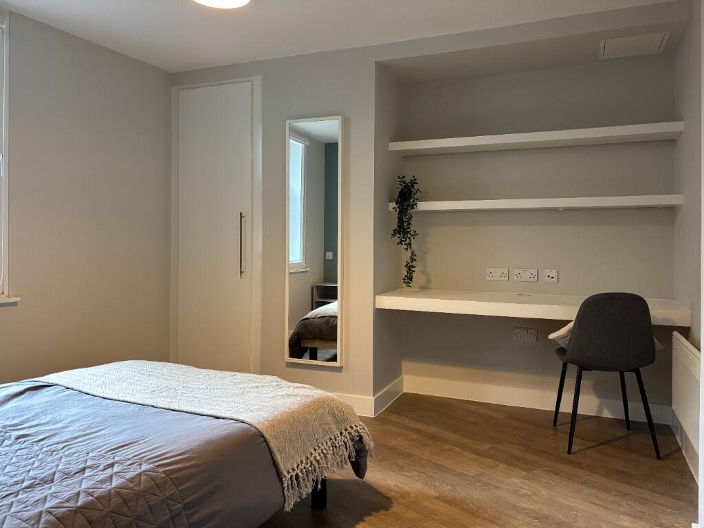 Each apartment comes equipped with a wardrobe, a 4ft double bed, and a fitted desk with shelving for your study needs. The kitchen area includes a fridge with an icebox, a stainless steel combination microwave/grill, and a double ceramic hob with an extraction hood, ensuring you have everything you need for convenient living.