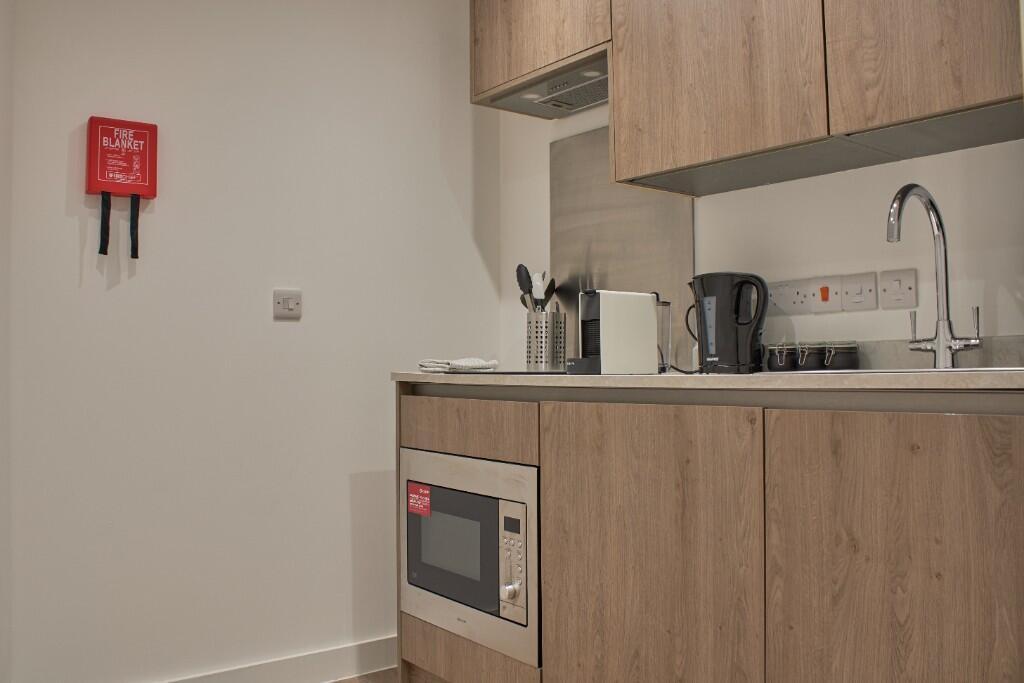 This stylish apartment is equipped with high-quality, space-saving furniture and a modern kitchen fitted with essential appliances, including a fridge/freezer and a microwave combi oven. A communal laundry area adds to the convenience, making this the ideal home for students seeking comfort and quality in a prime location.