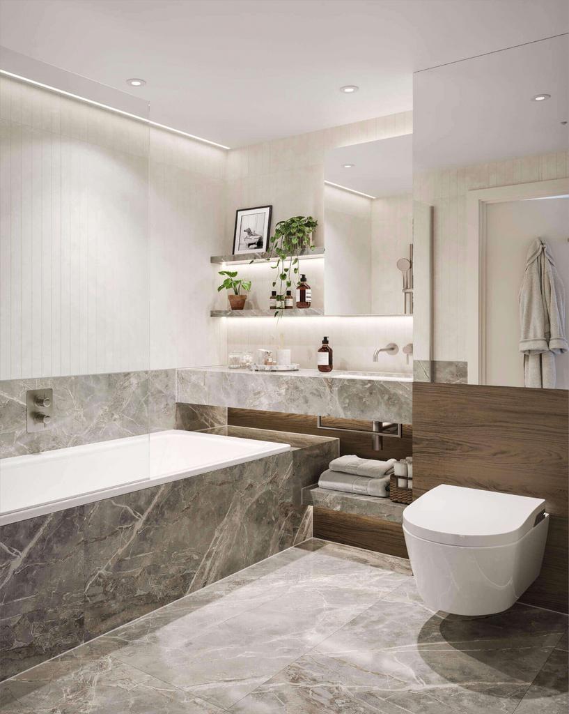 All three bedrooms are well proportioned, with the principal bedroom benefiting from an ensuite bathroom and built-in storage. The additional bedrooms are ideal for family, guests or use as a home office, while a second contemporary bathroom serves the rest of the apartment. High-quality finishes and modern detailing are consistent throughout, creating a refined and comfortable living environment.