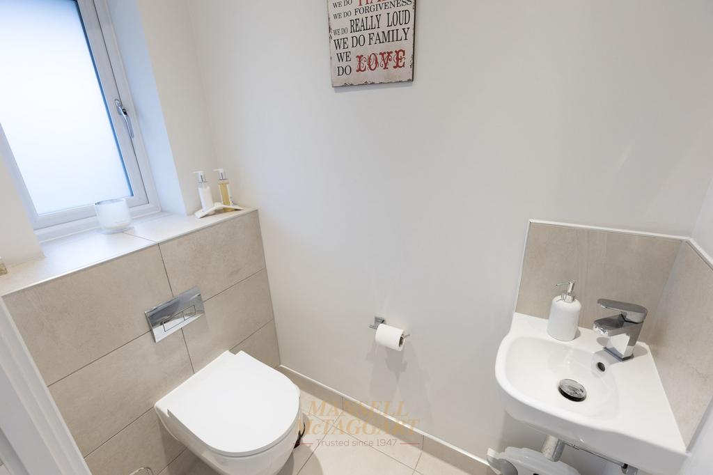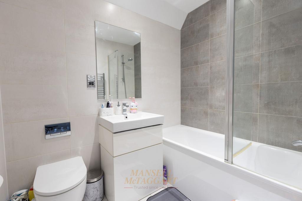 The first of the two family bathrooms complete the first-floor living, finished with tiled walls, wash hand basin, low level W.C, panelled bath with shower oven and glass shower screen.