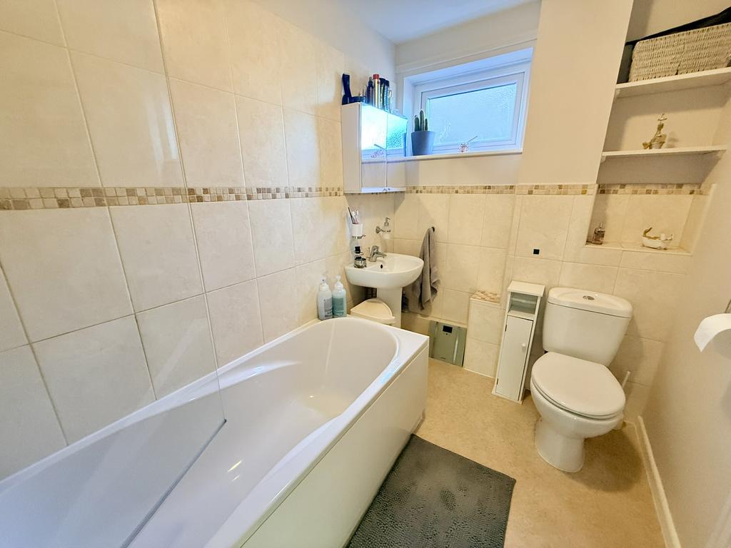Modern fitted white suite comprising: panelled bath with power shower and glass shower screen over, pedestal wash hand basin, close coupled WC, modern cream tiled splash backs, obscure double glazed window to side, radiator.