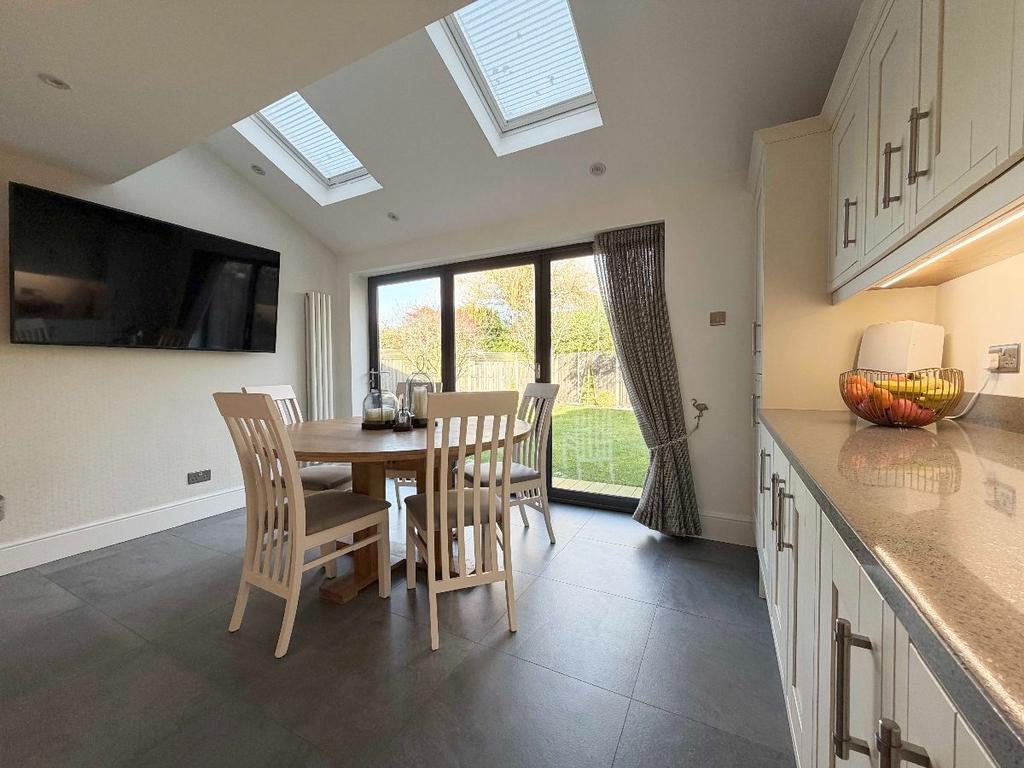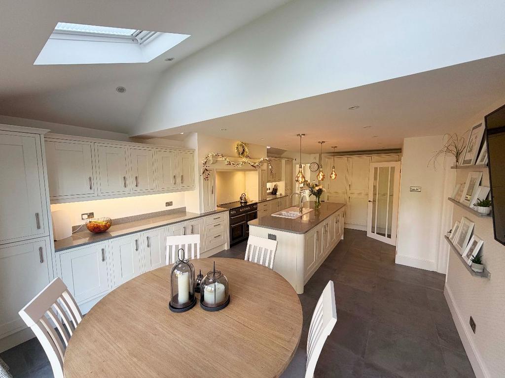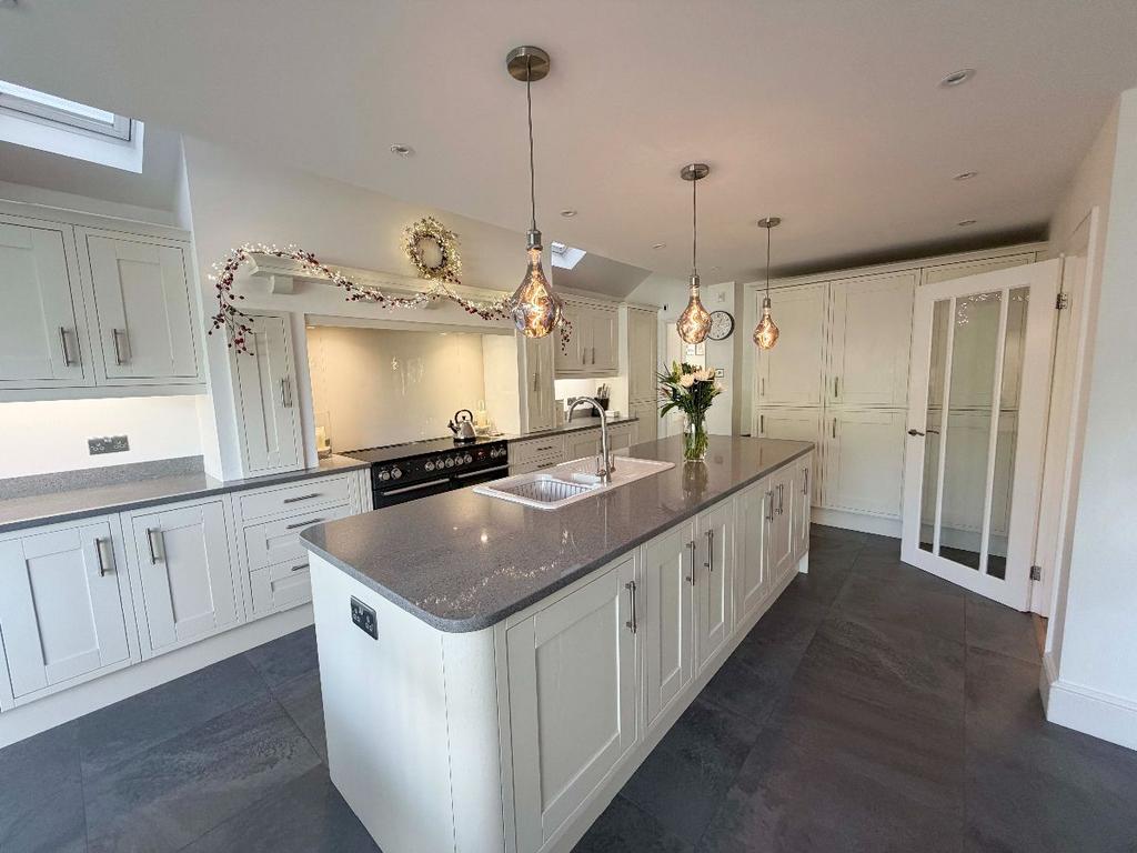 The lounge is truly impressive, flooded with natural light and centred to an open fire, perfect for social or cosy nights in. The open plan kitchen is equally as impressive, with an array of built in appliances, space for dining table and chairs, supported by a sizeable utility, housing the boiler and offering access to the driveway.