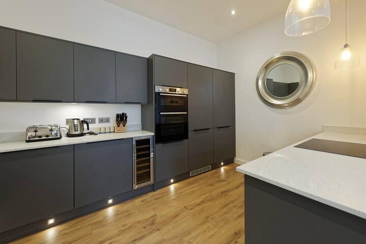 The open plan kitchen with breakfast bar has a fully integrated fridge freezer, washer dryer, matt black one and half bowl over mount composite sink, wine cooler, dishwasher, fan assisted oven with ceramic induction hob and granite worktops.