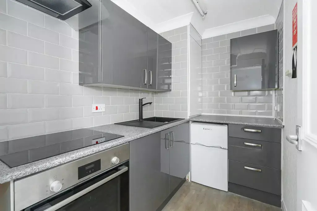 The apartment building is accessed via a secure automated door entry system, with both lift and stair access to the first floor. The accommodation comprises an open-plan living area with a part partitioned bedroom space featuring a fitted wardrobe, a modern separate kitchen, and a bathroom.