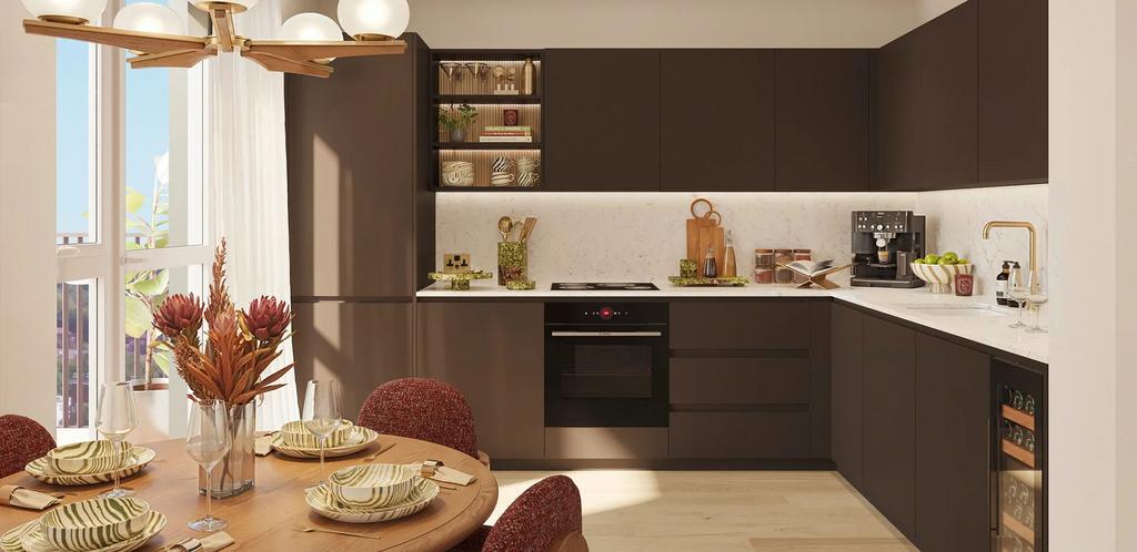 The apartment features a bright and spacious open-plan living, dining, and kitchen area designed to maximise natural light and functionality. Large doors open directly onto the private terrace, creating a seamless indoor-outdoor flow and providing an ideal setting to unwind while enjoying landscaped surroundings. The kitchen is finished to a high modern standard, with sleek cabinetry and integrated appliances designed for both style and practicality.